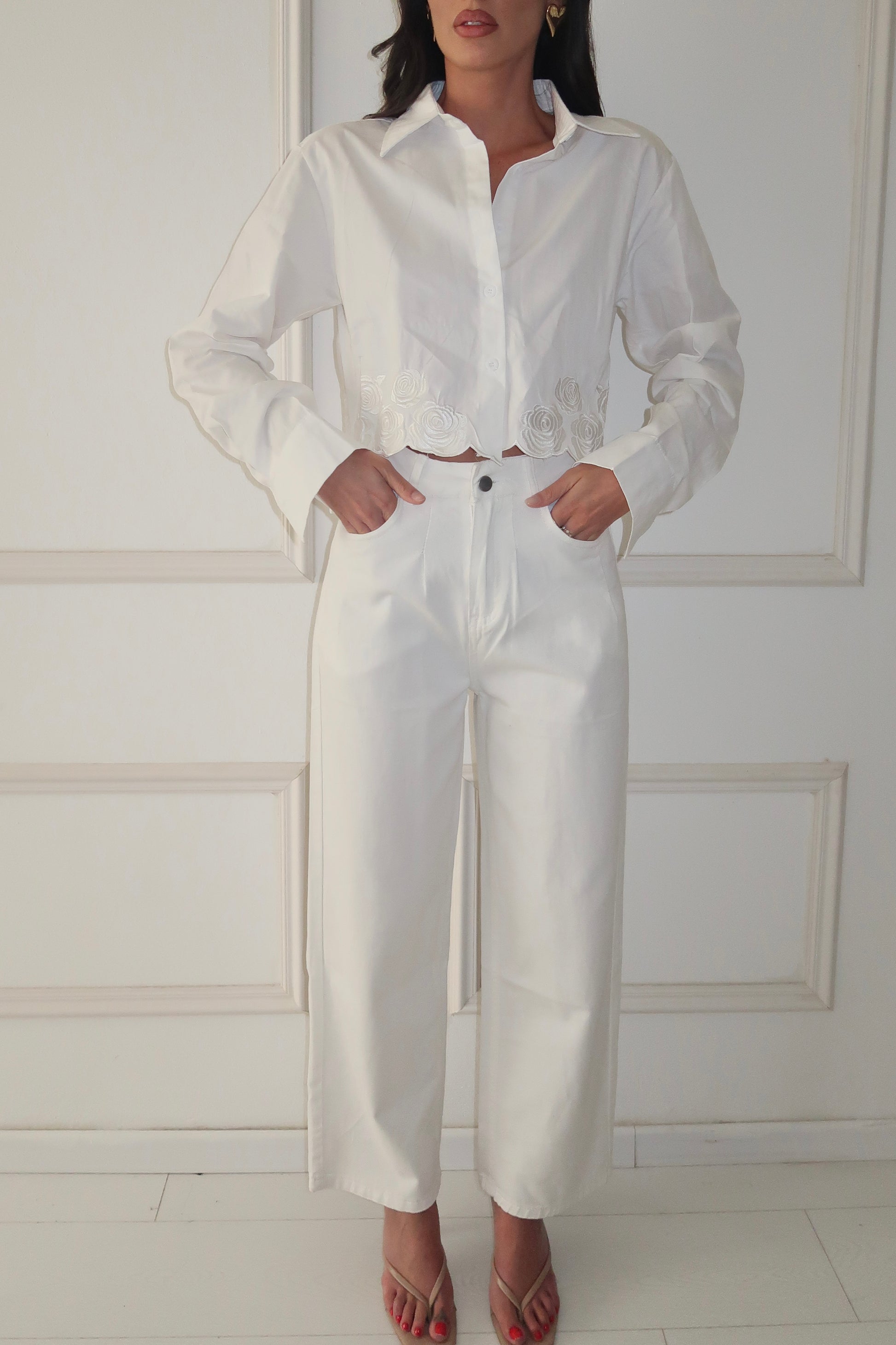 חולצה מכופתרת בגזרת קרום עם סיומת פרחים