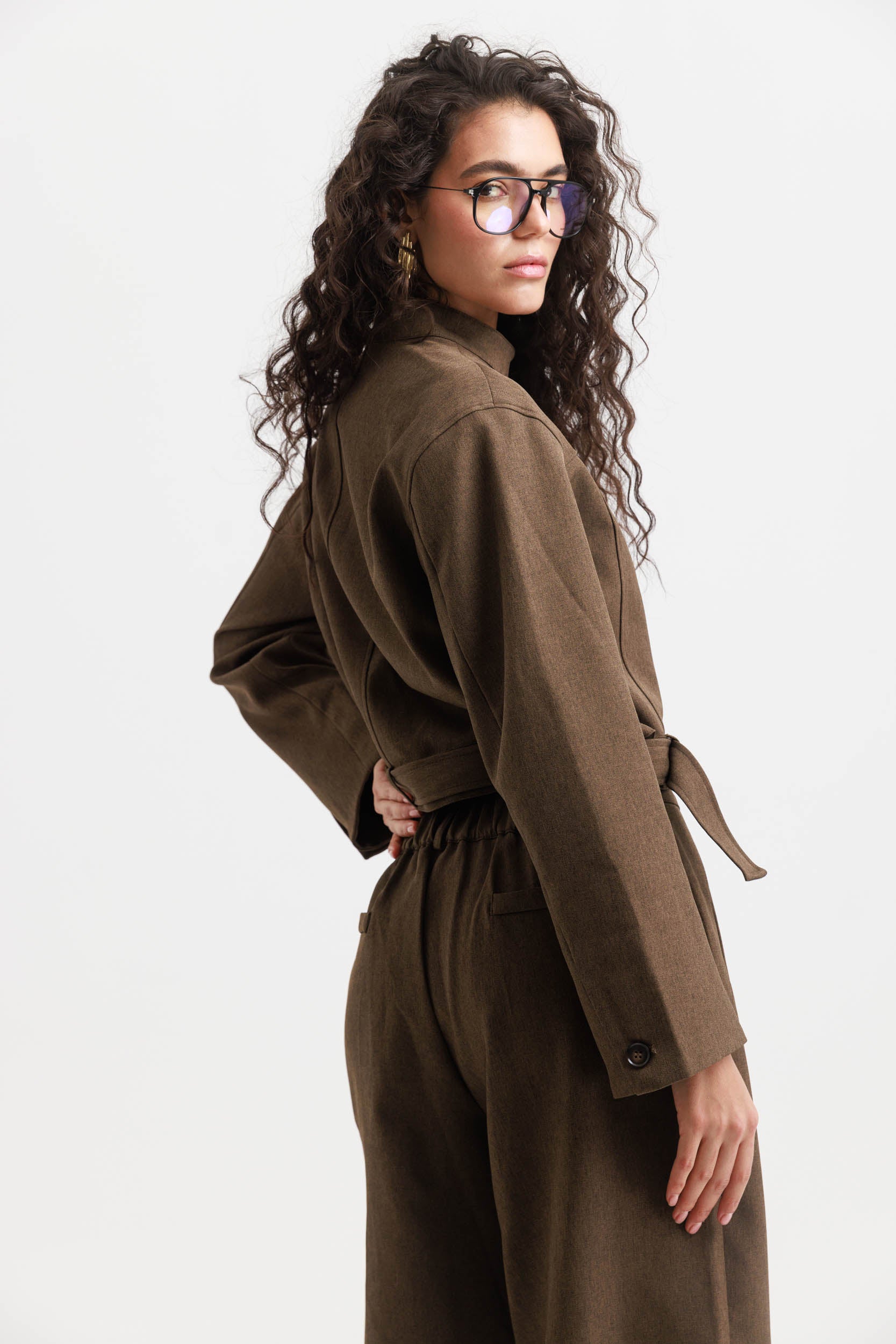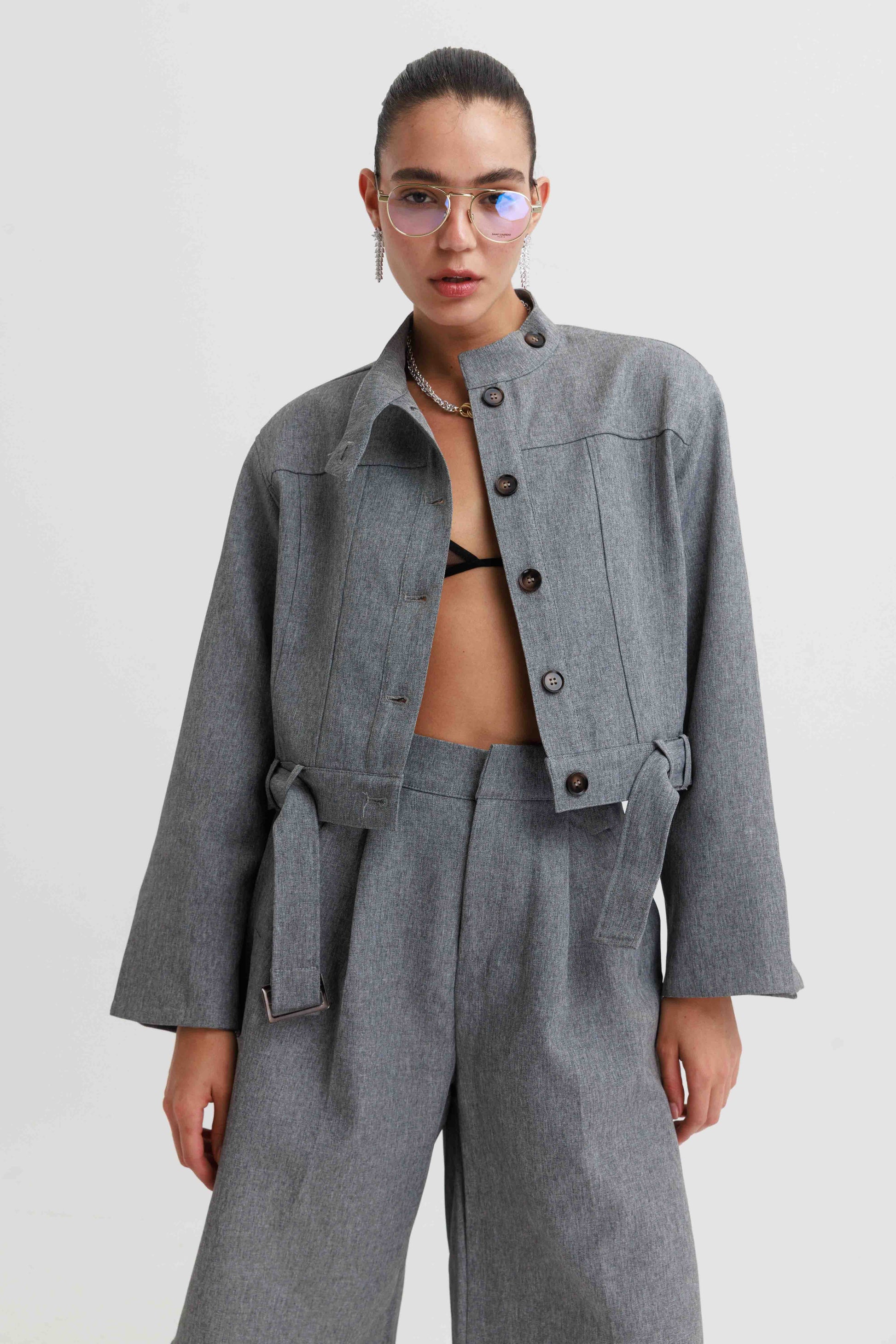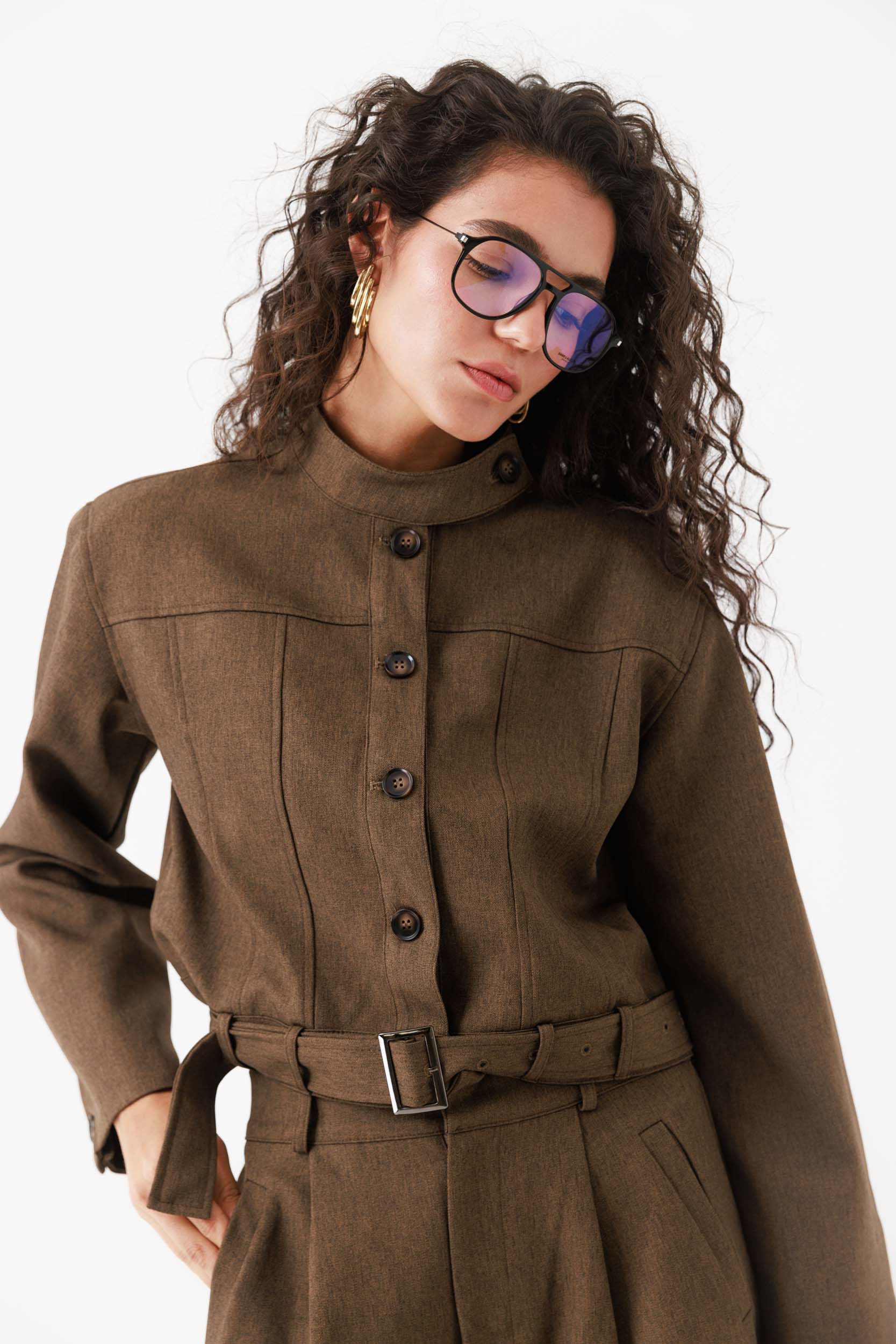 העליונית מגיעה עם צווארון עומד, כפתורים קדמיים ותפרים מבניים המעניקים צורה מחמיאה