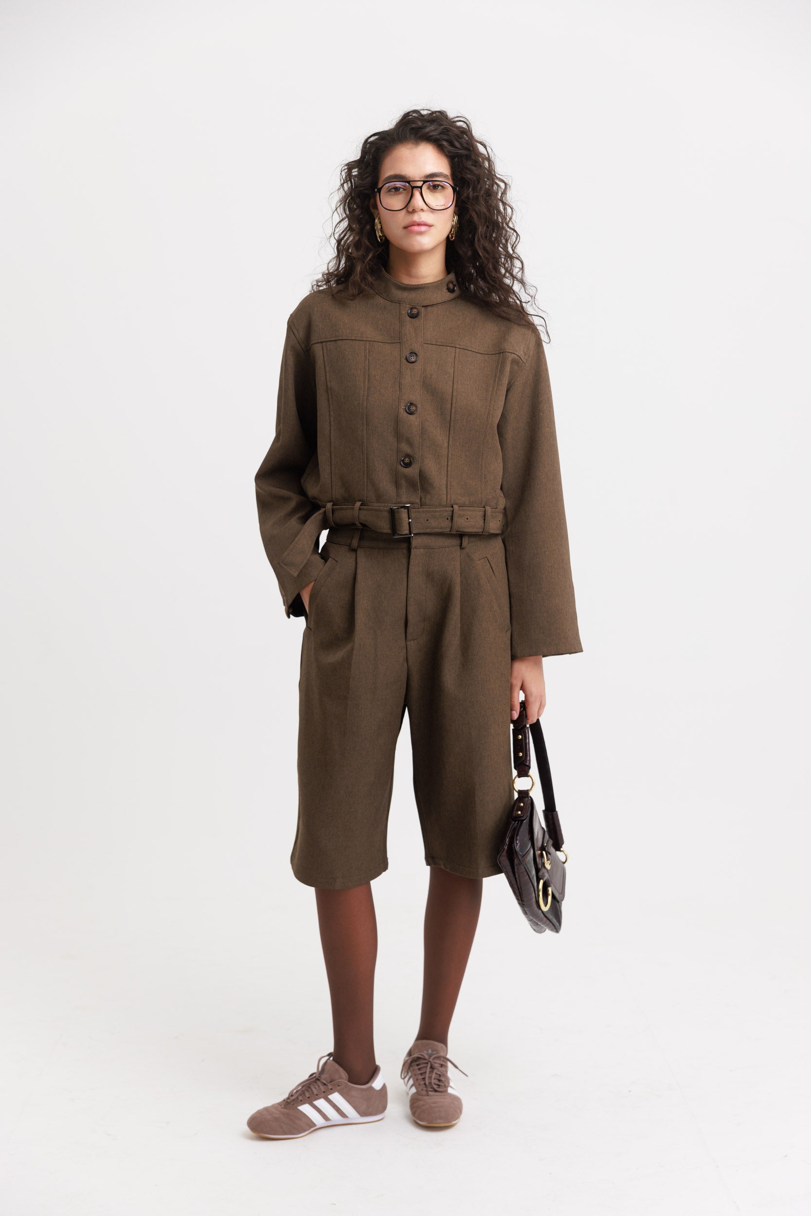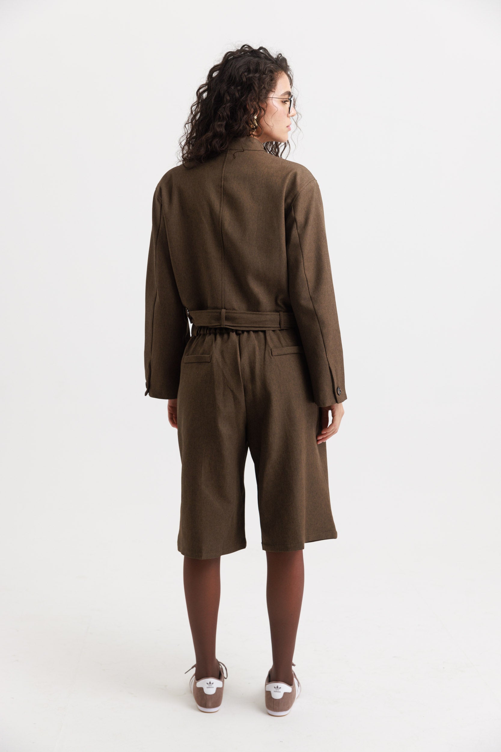 המכנס הוא ברמודה באורך מתחת לברך עם גומי עדין מאחור, כיסים קדמיים וחגורה תואמת ליצירת מראה אחיד
