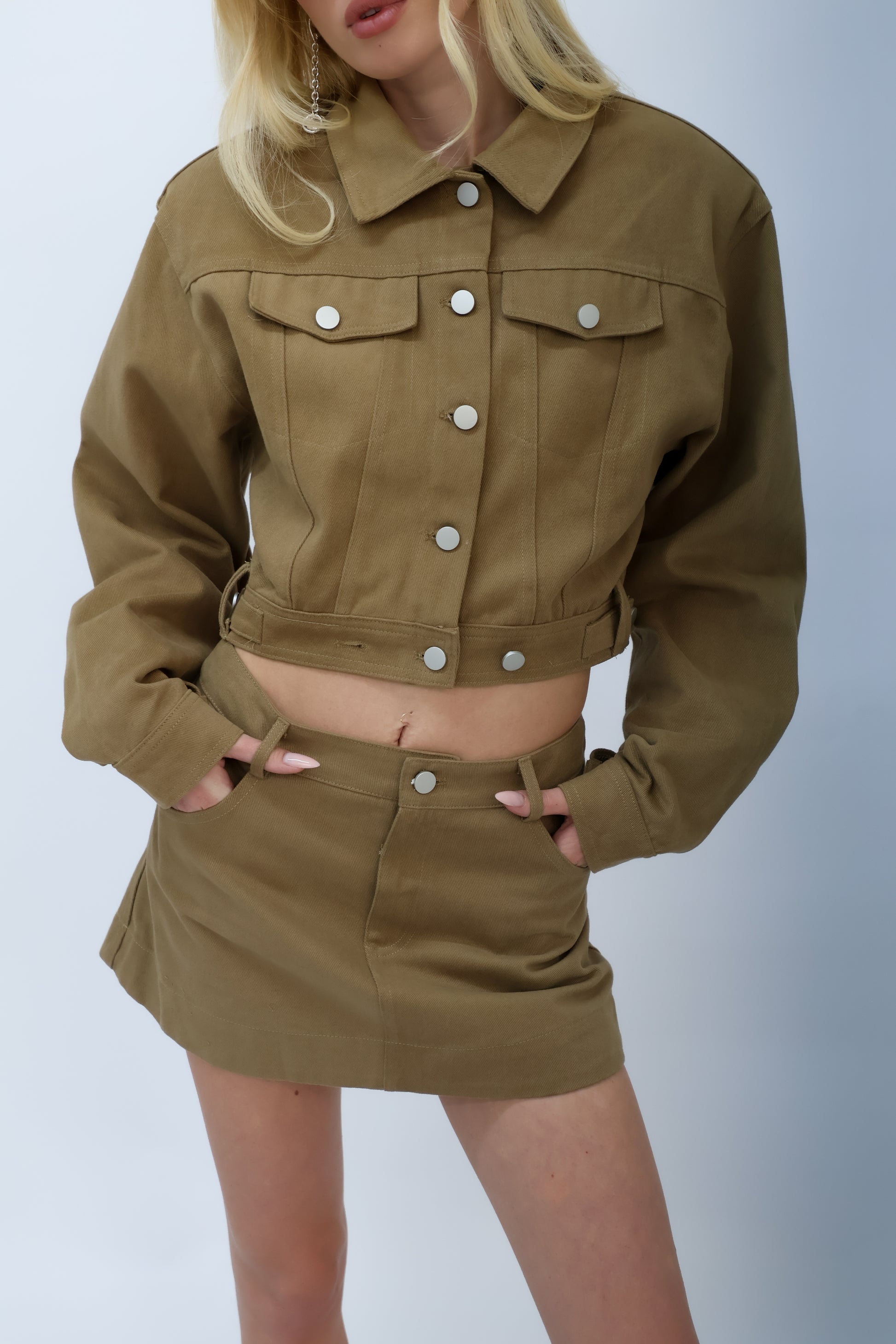 חליפת שני חלקים בגוון קאמל- ג׳קט קרופי וחצאית מיקרו מני