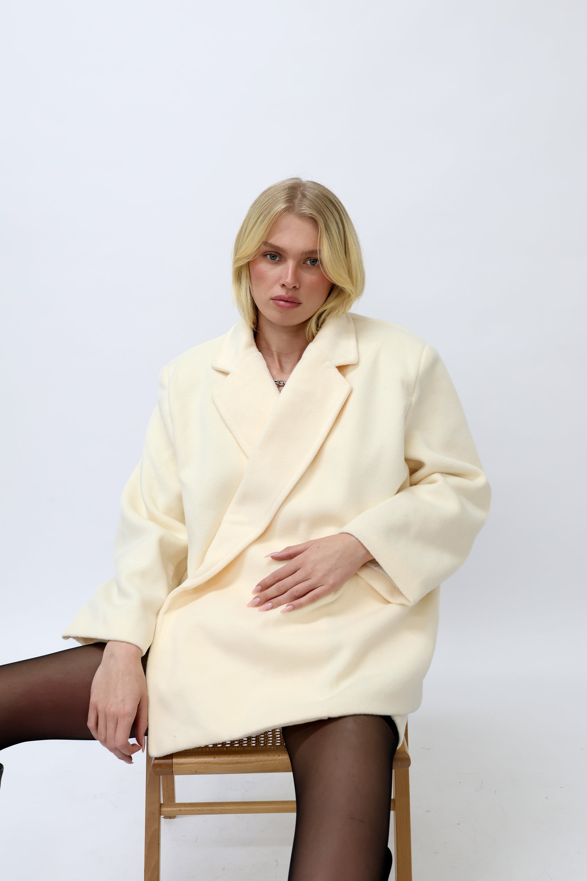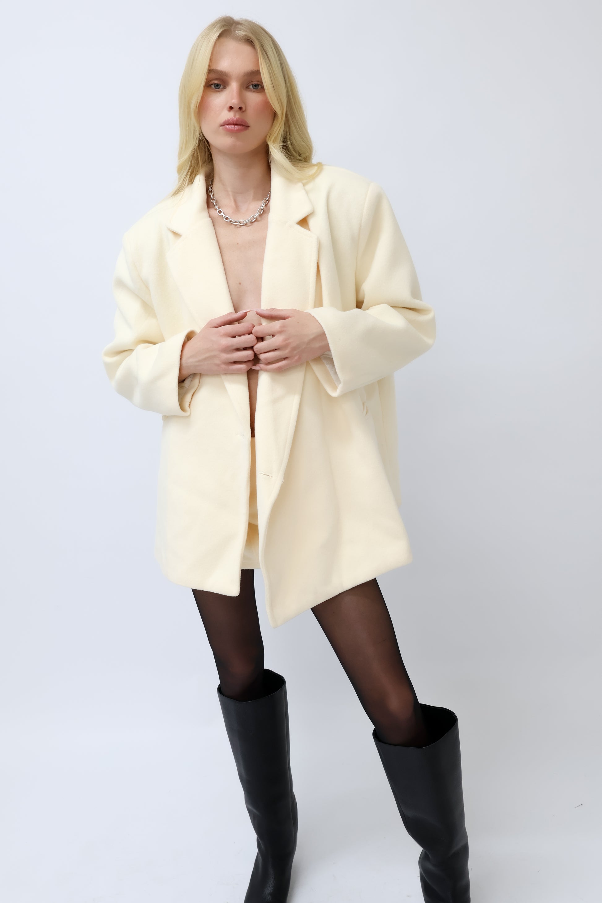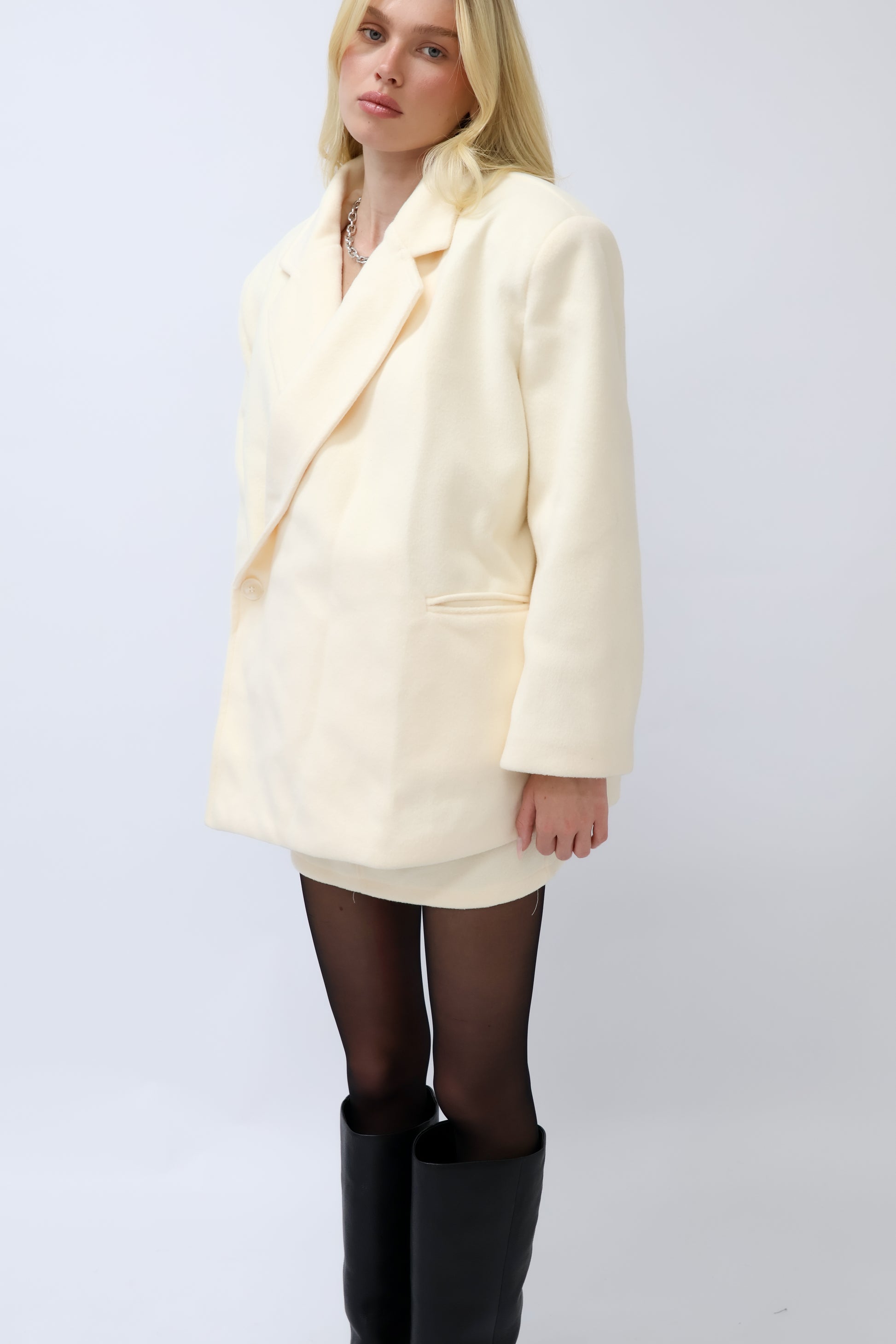 חליפת דמוי צמר שני חלקים בגוון שמנת, בלייזר אוברסייז ברכיסה צדדית וחצאית מיקרו מיני