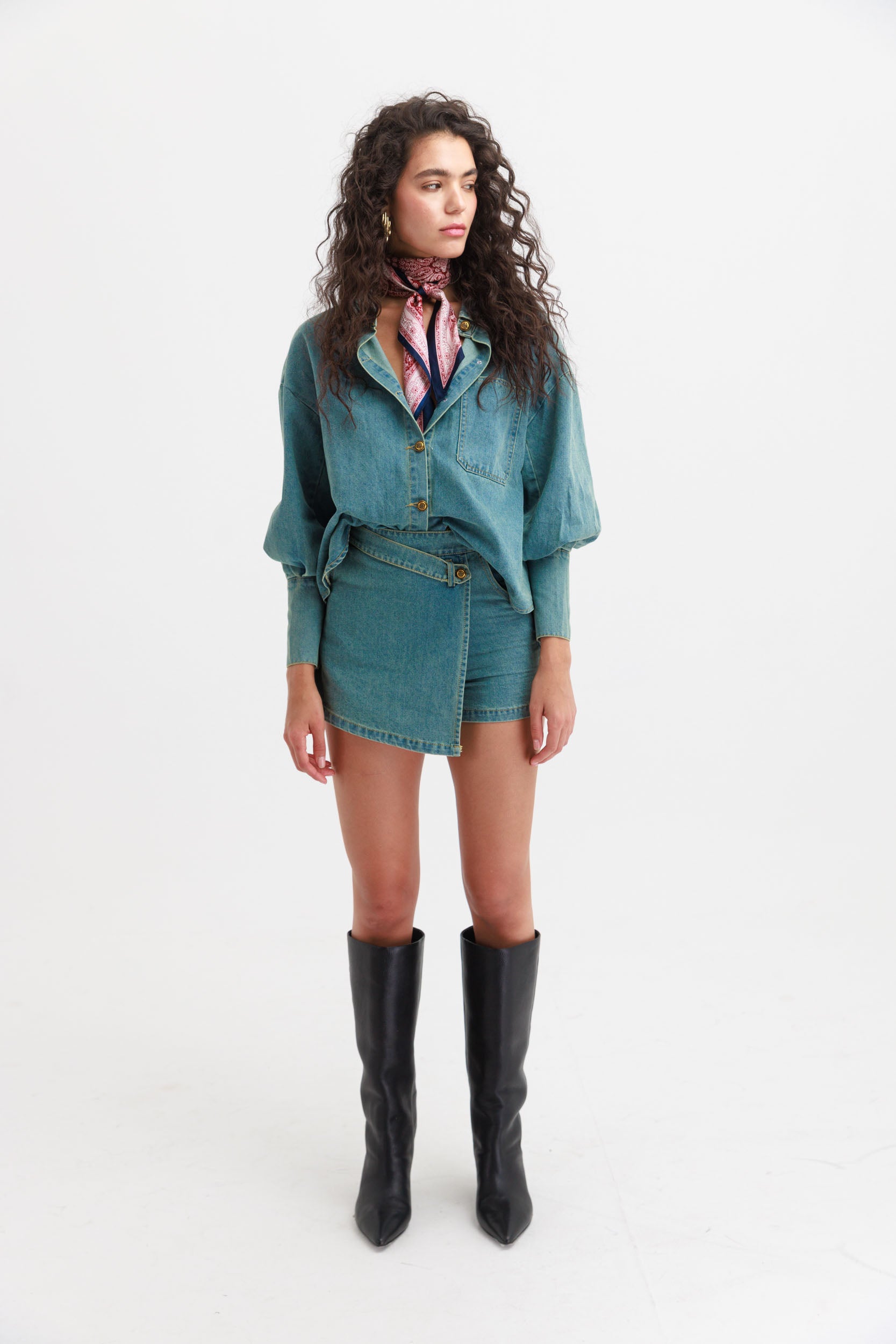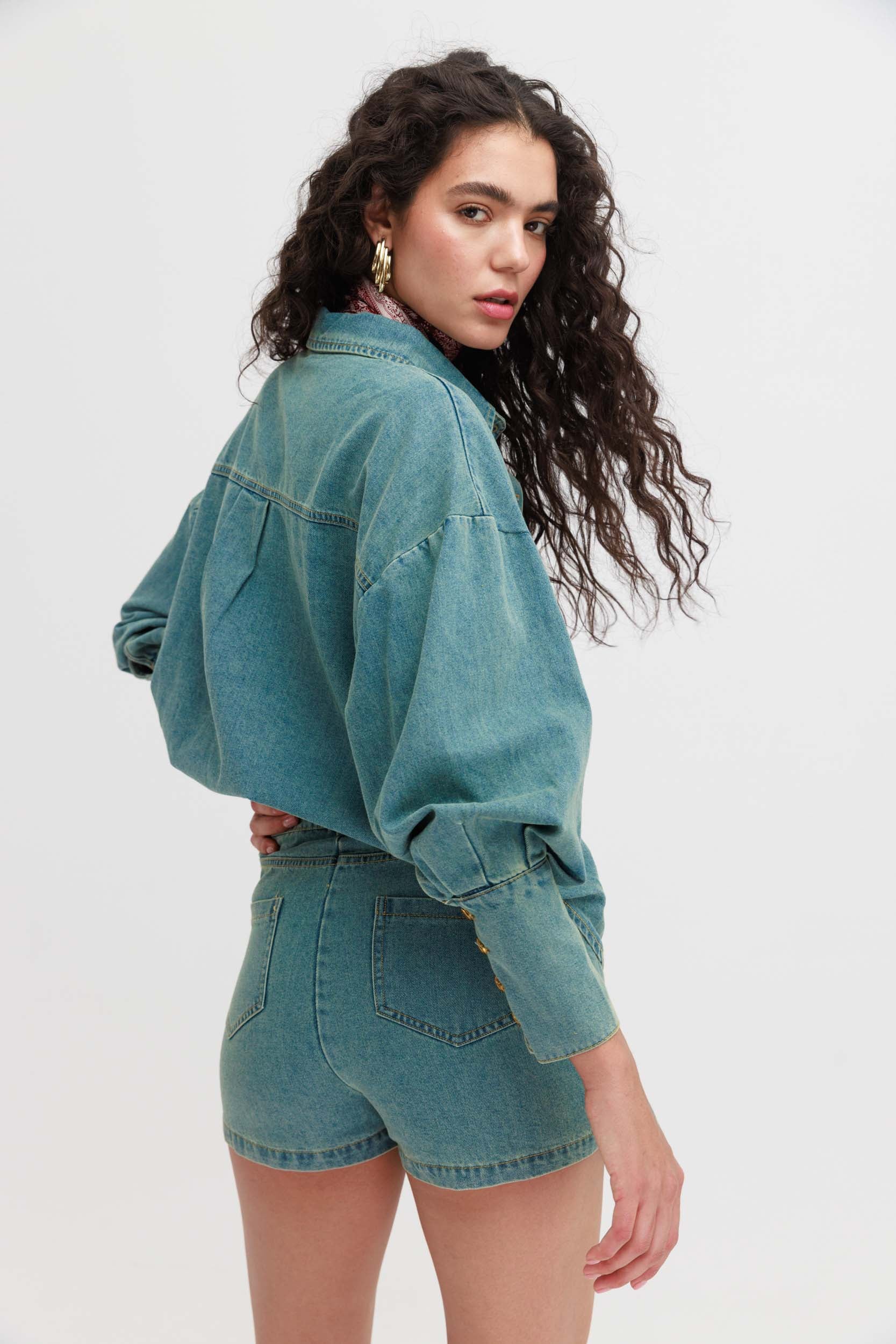 חליפת דנים הכוללת חולצת ג׳ינס בגזרה משוחררת עם שרוולים רחבים ודיטייל׳ס כפתורים עדין לאורך השרוול