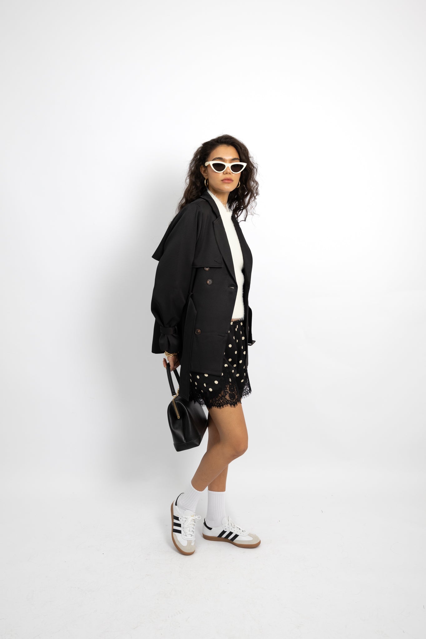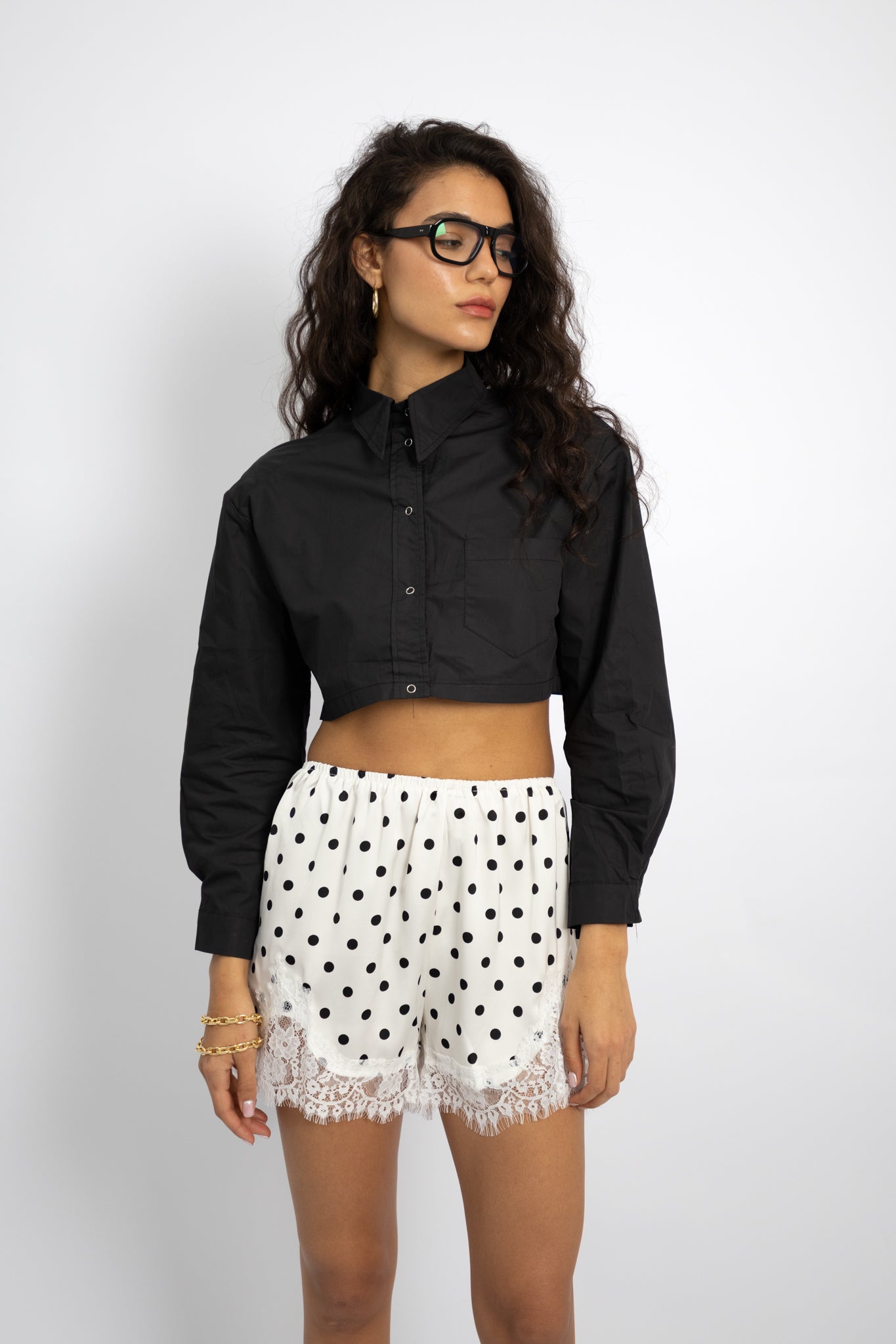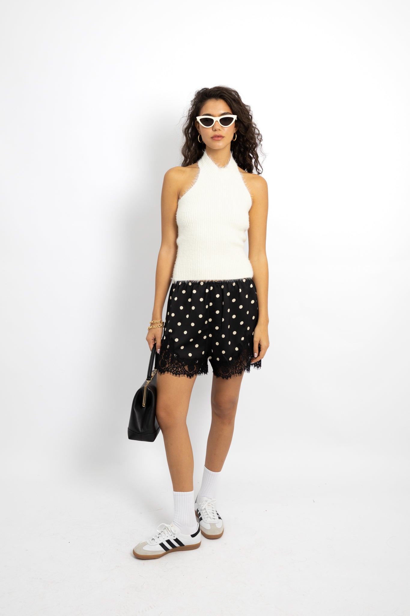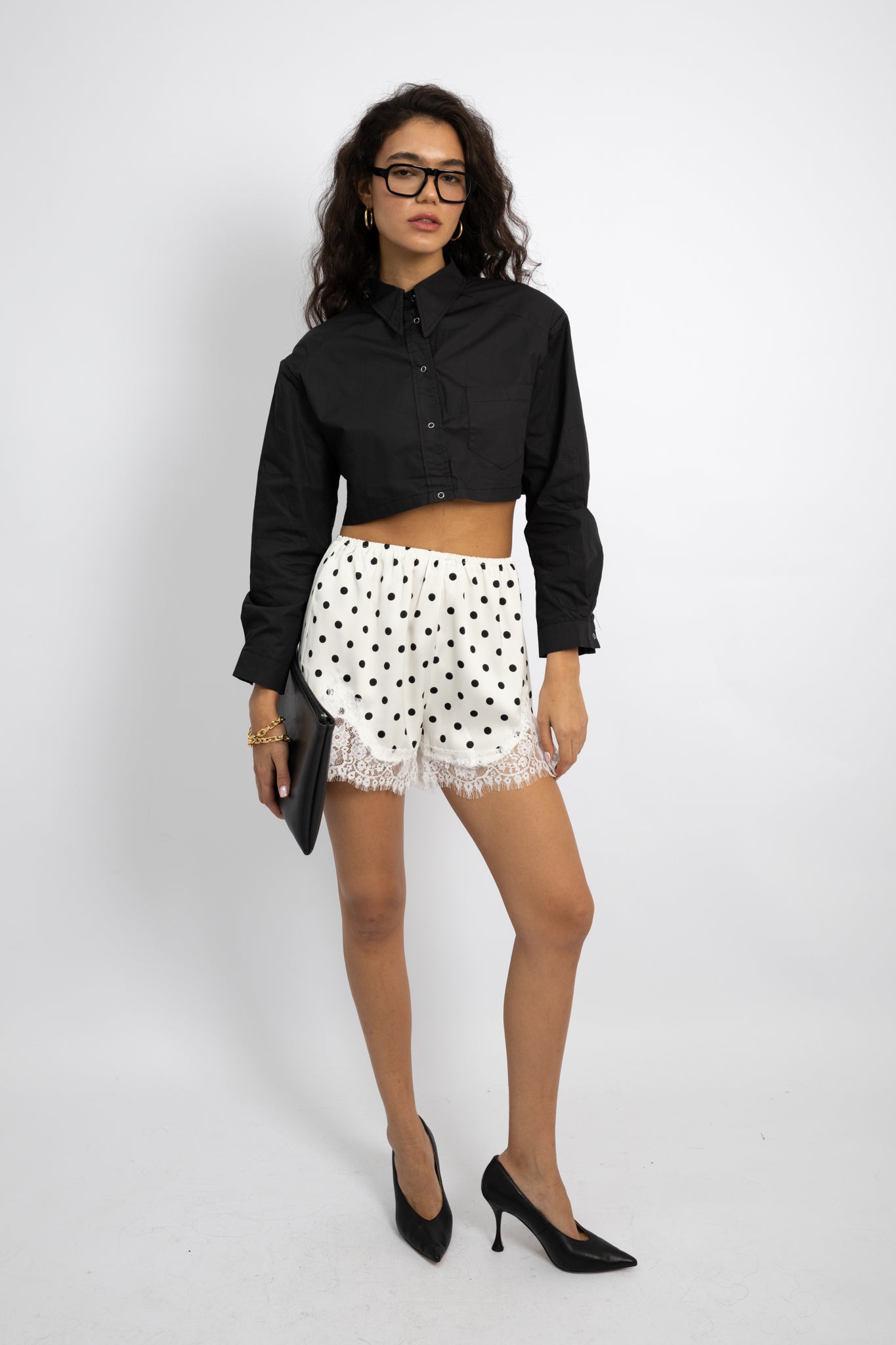 מכנס קצר דמוי משי עם הדפס נקודות ותחרה עדינה בתחתית, יושב קליל ונוח עם מראה מתוק ואלגנטי.