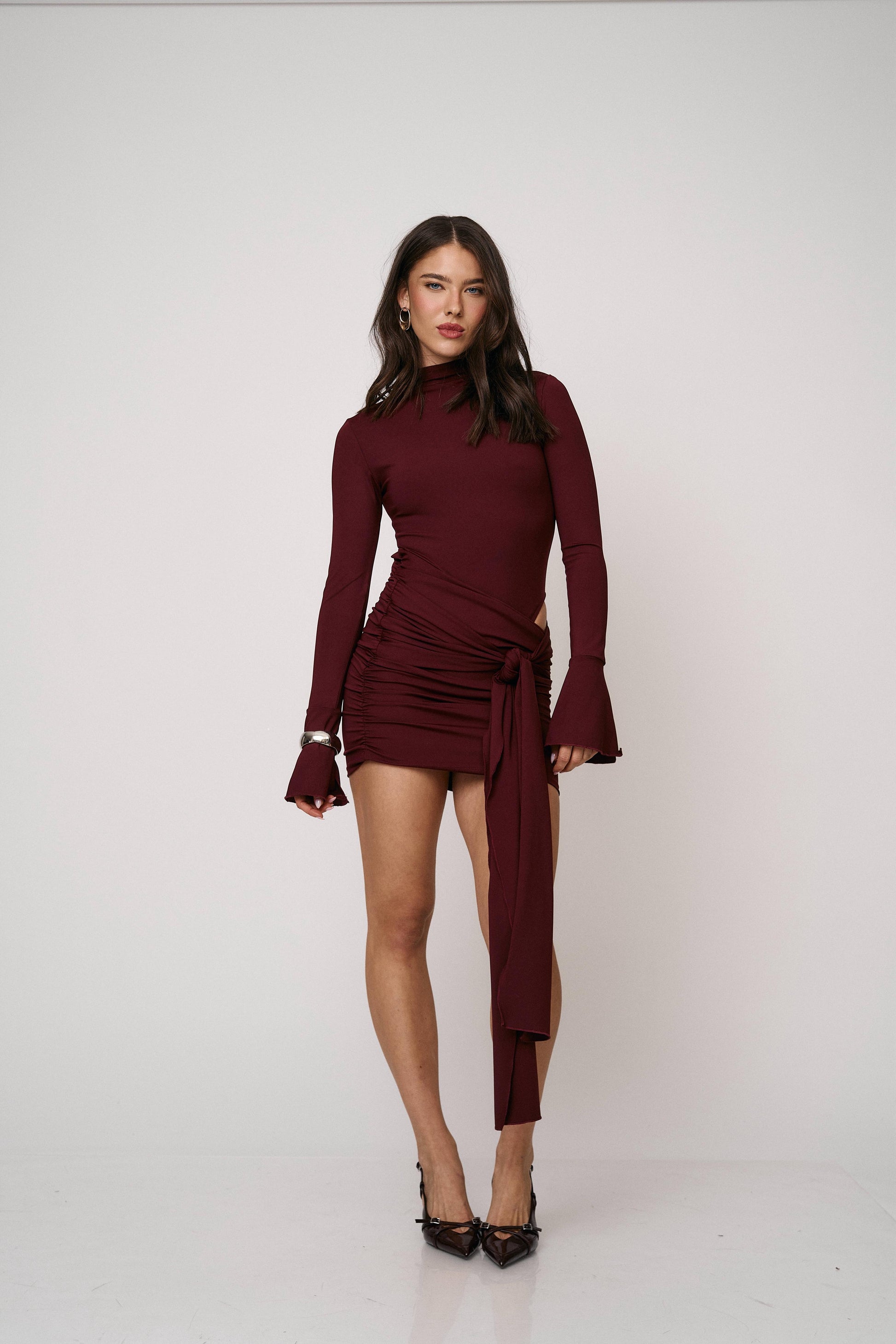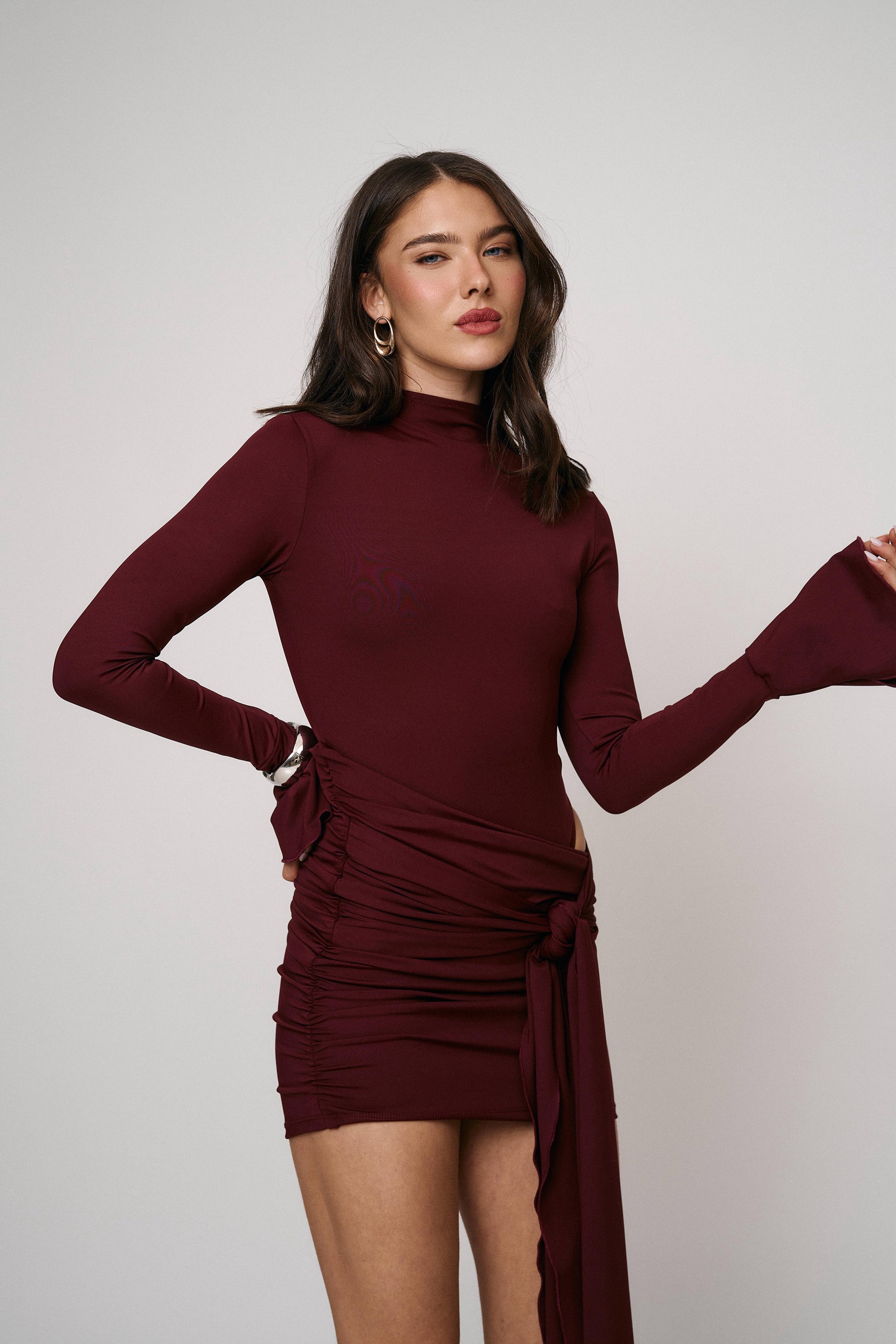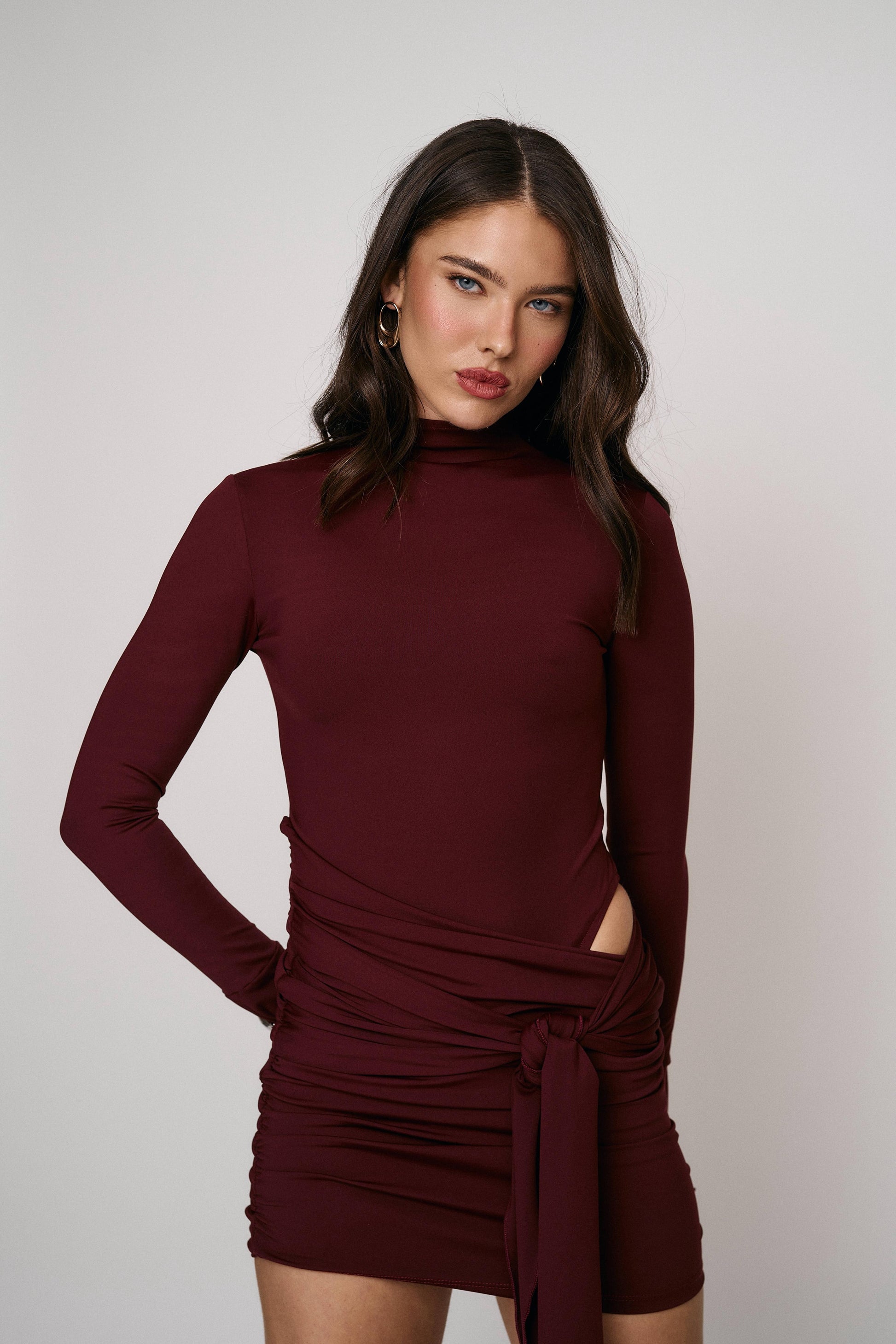 שמלה מחטבת עם שרוולים ארוכים וקשר מודגש במותן, לוק אלגנטי ומדויק לאירוע או ערב