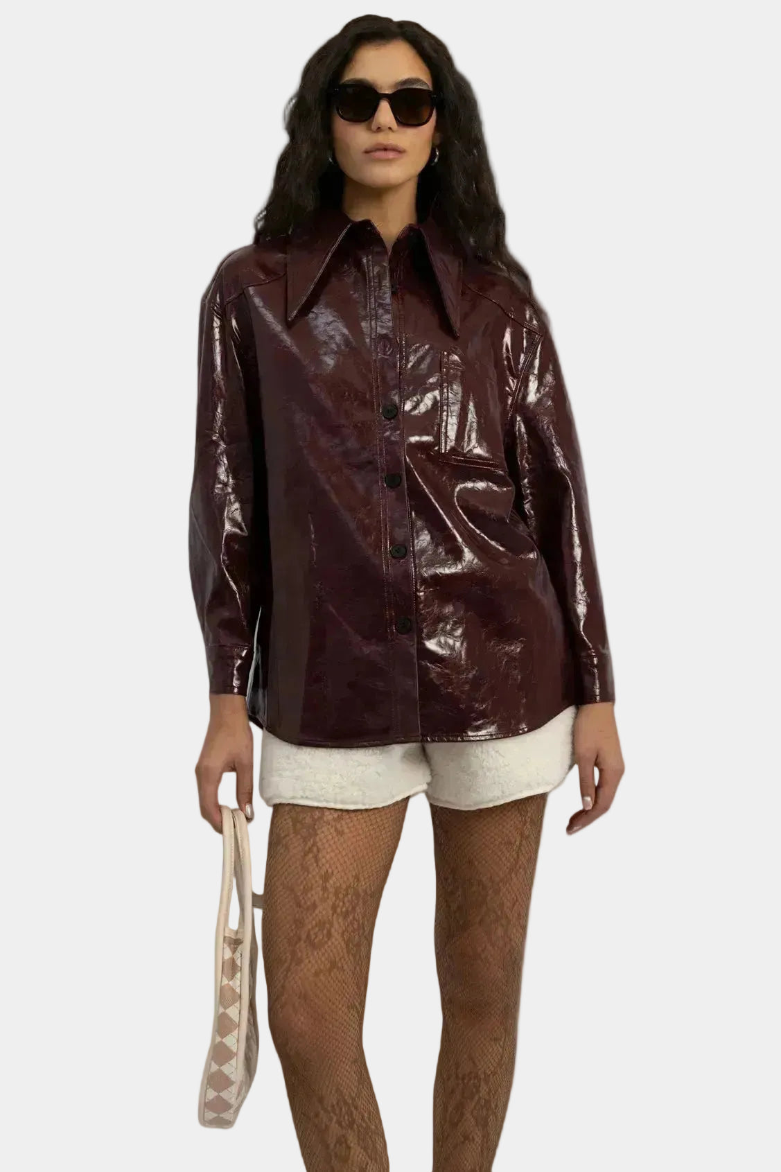 ז’קט דמוי עור בגימור מבריק עם סגירת כפתורים וגזרה משוחררת.