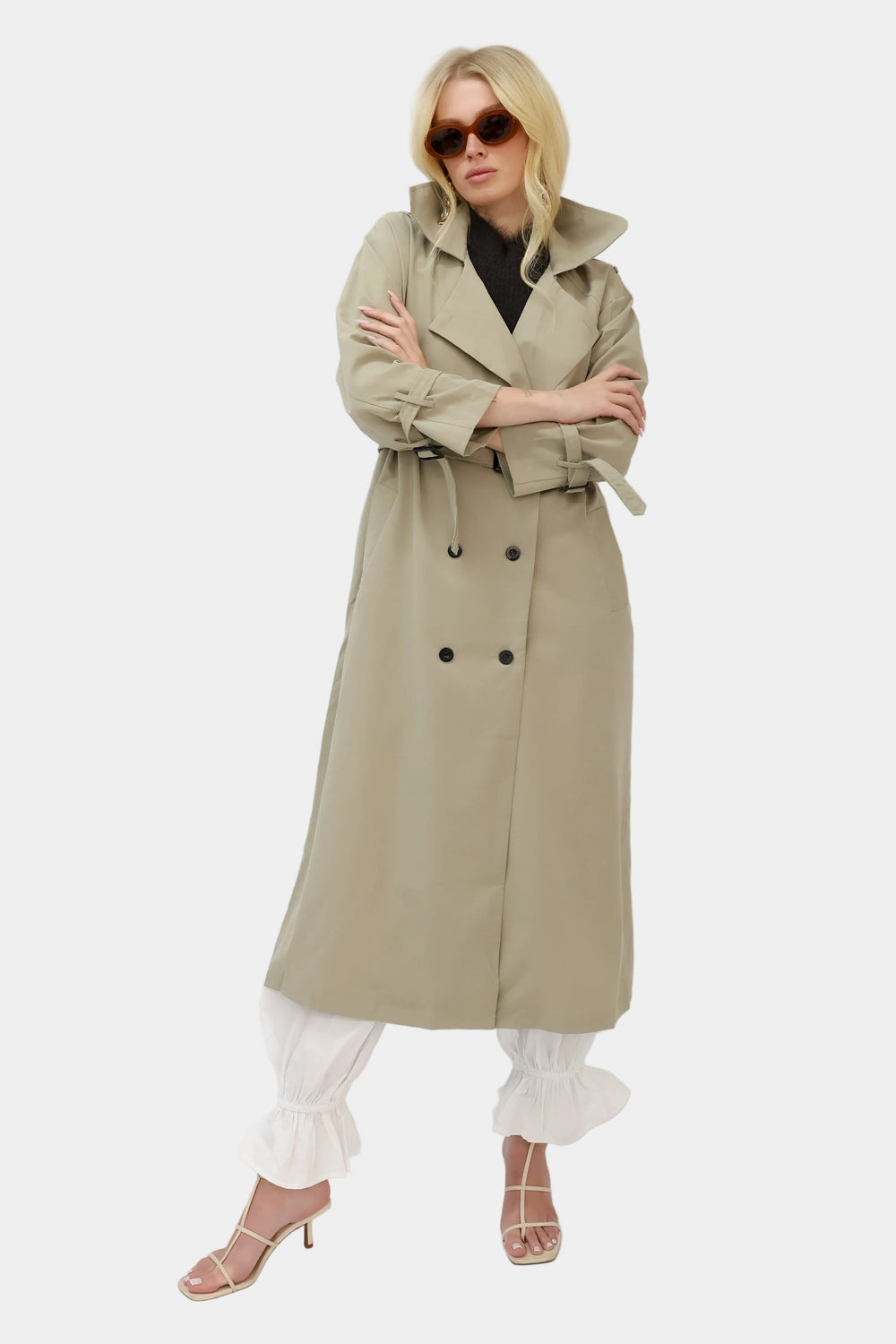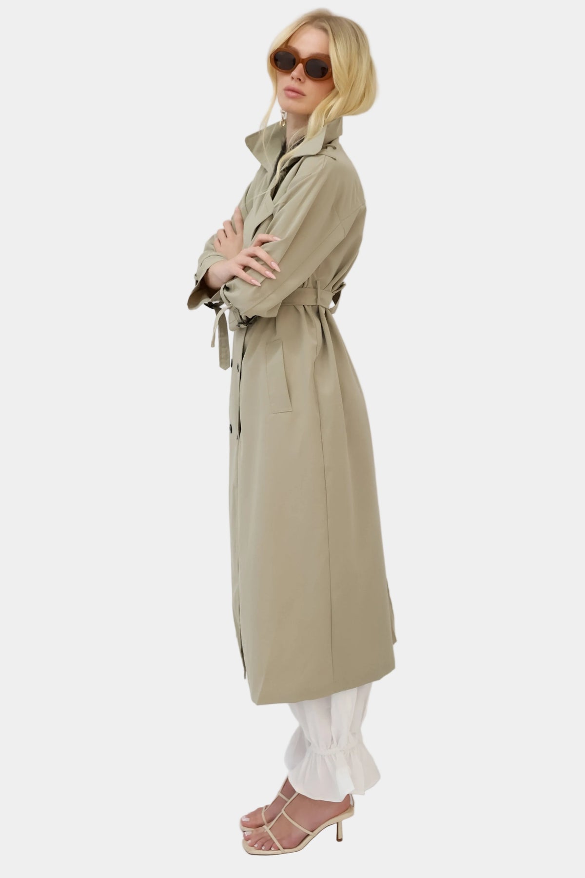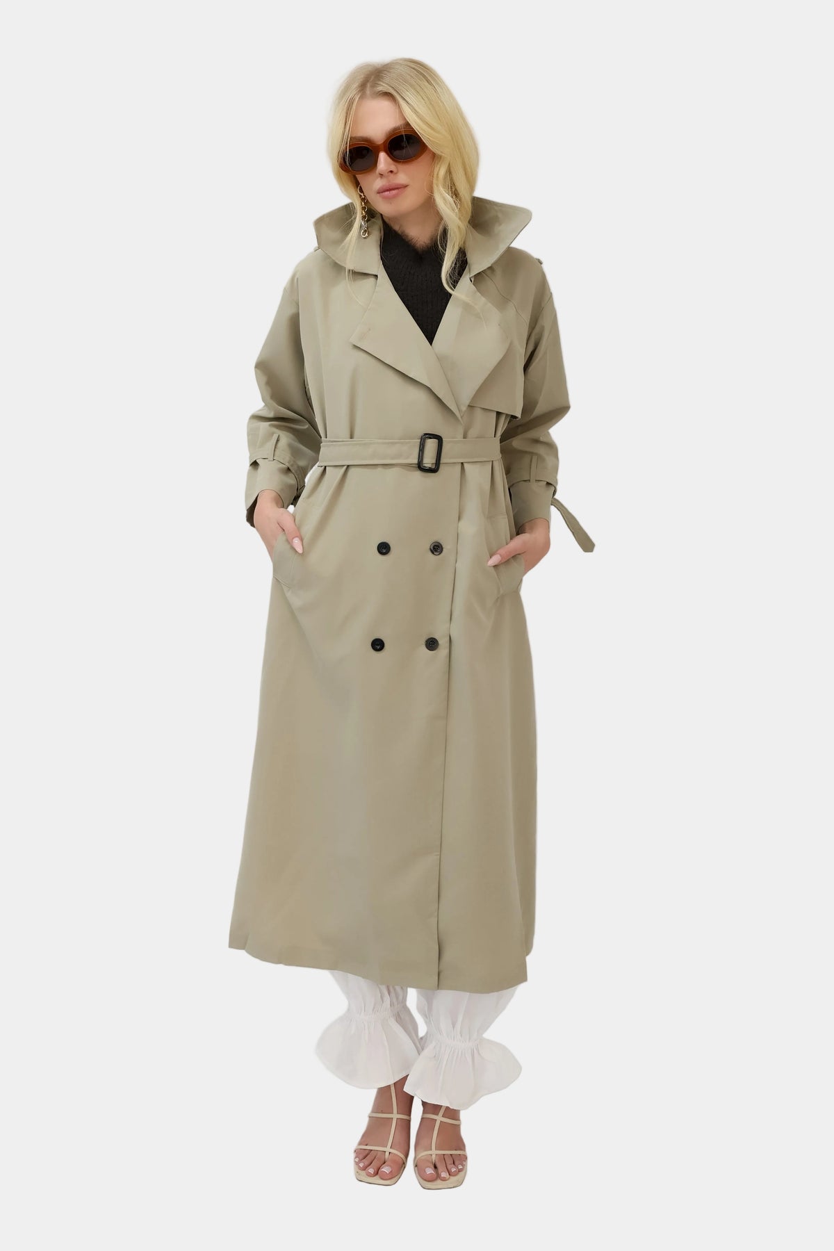 מעיל טרנץ’ ארוך בגזרה משוחררת עם צווארון קלאסי וסגירת כפתורים.