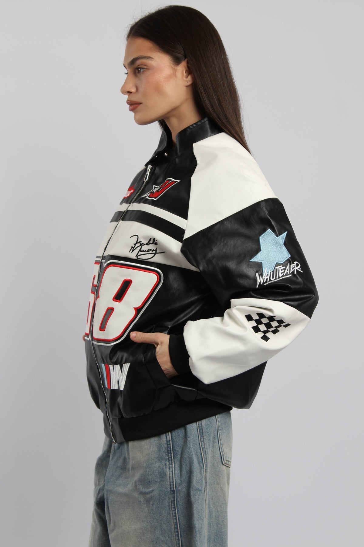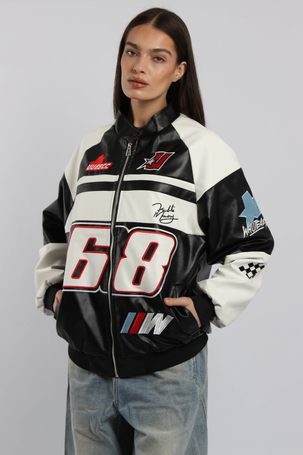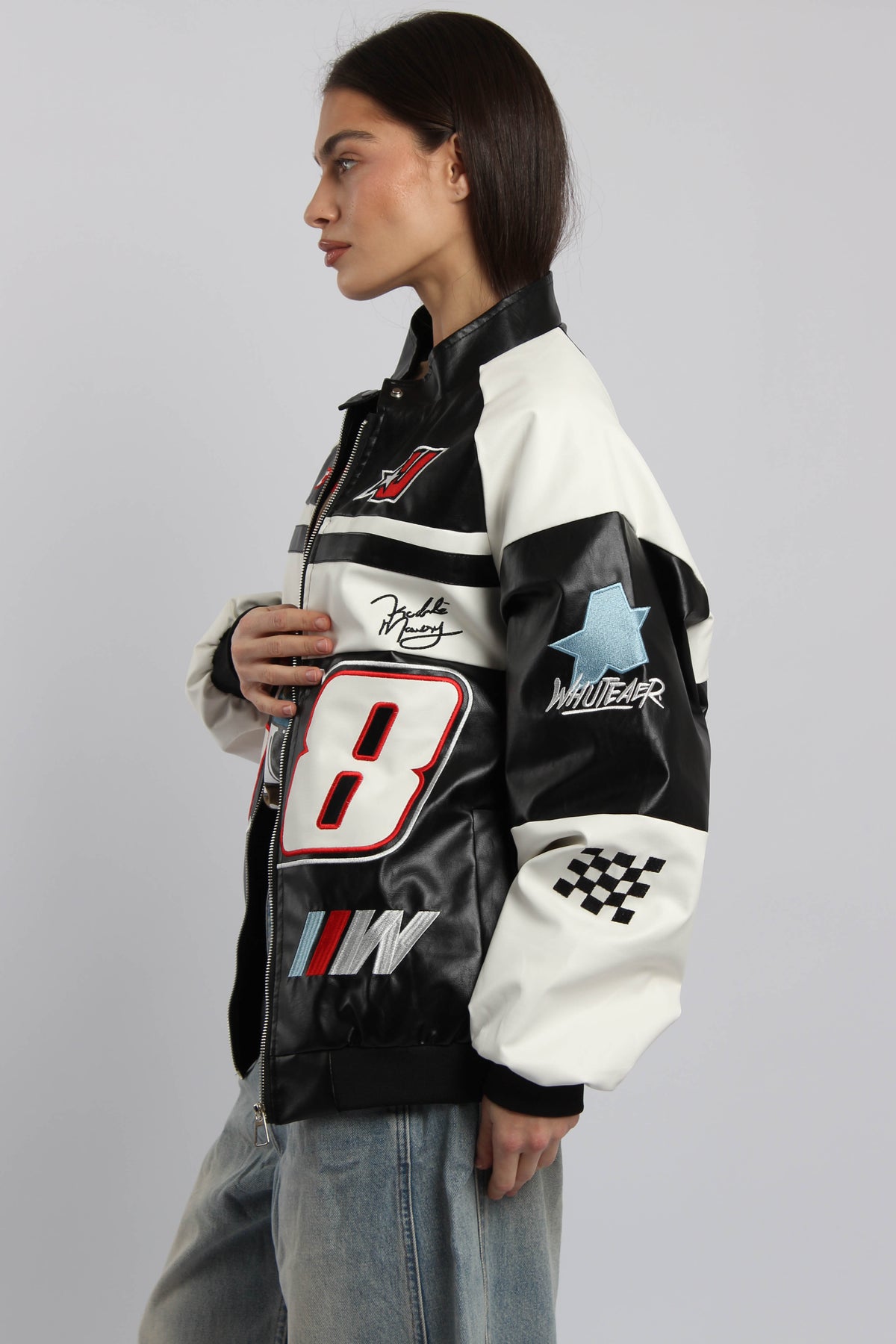 ג׳קט שש שמונה בסגנון מירוצים עם סגירת רוכסן ופאצ׳ים גרפיים, משלב מראה ספורטיבי בולט עם נוכחות אורבנית חזקה.