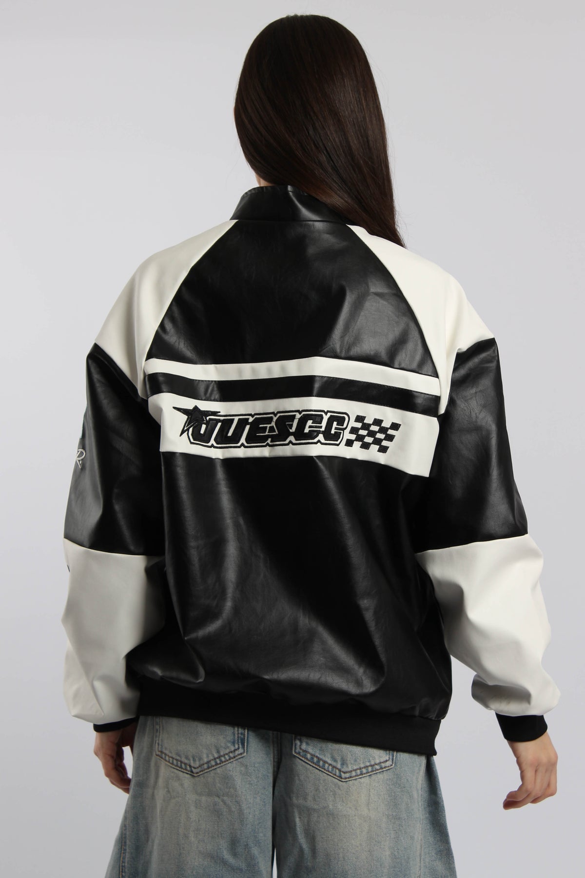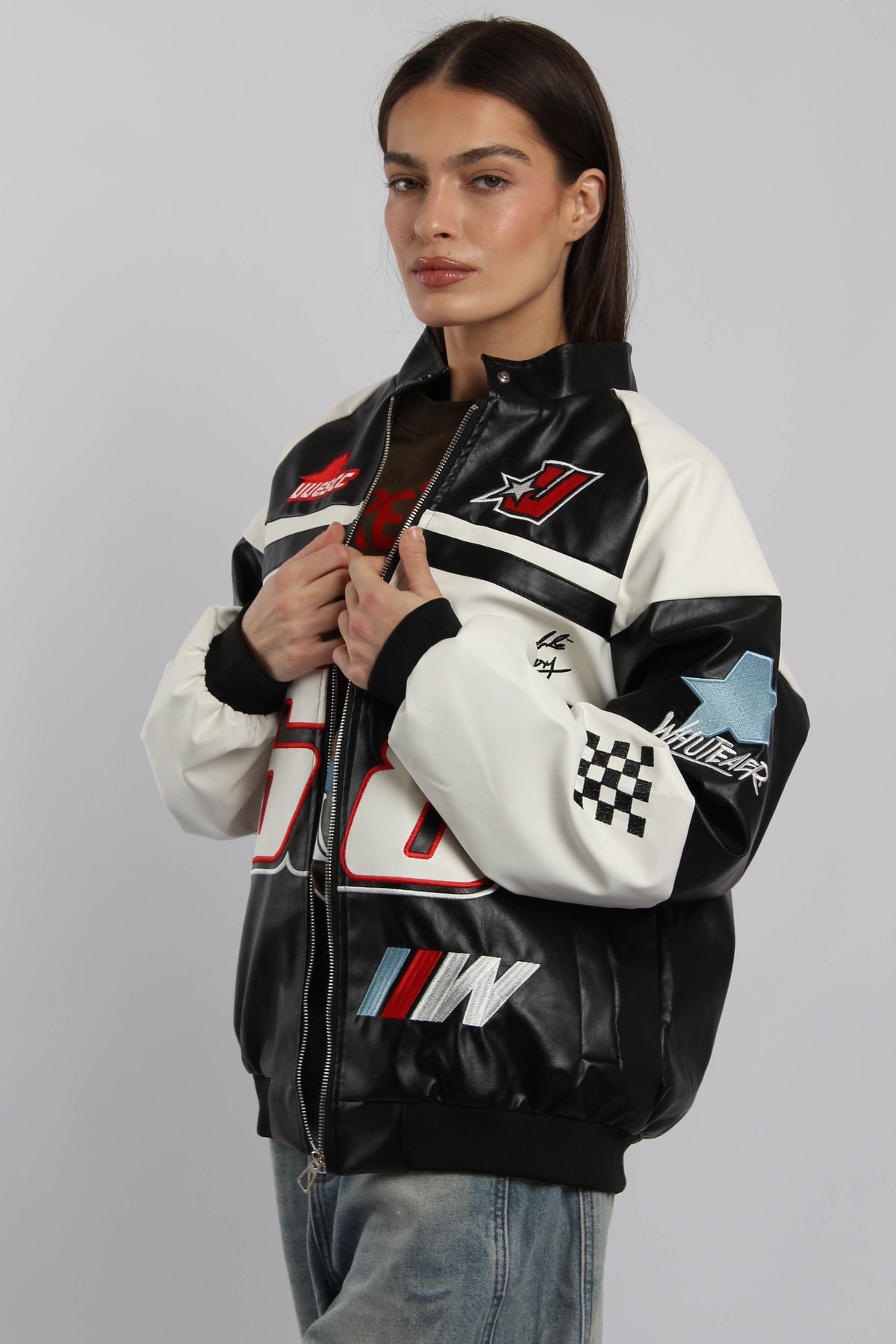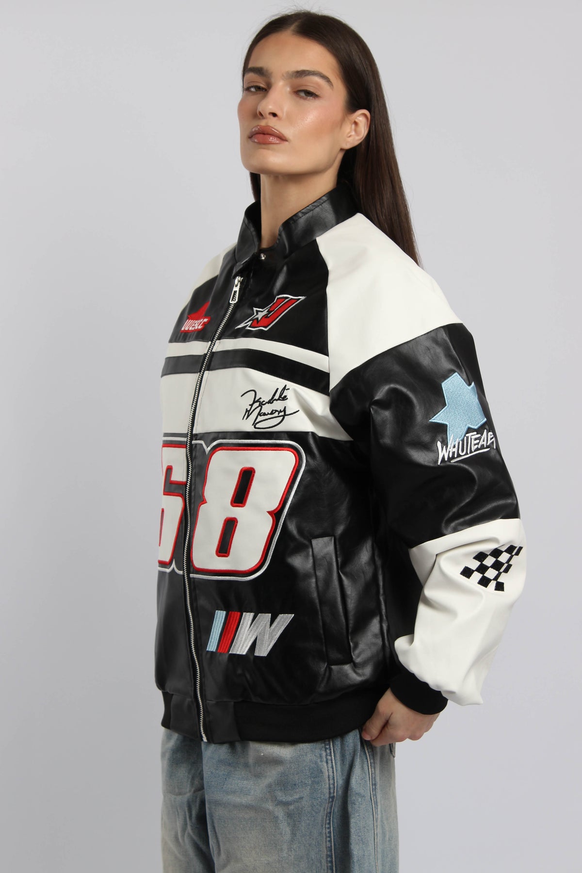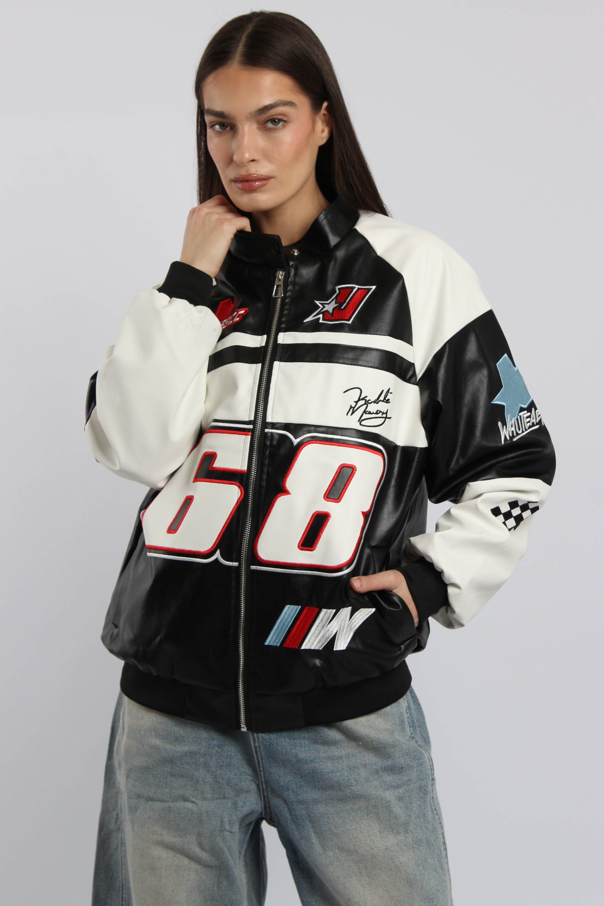 ג׳קט שש שמונה בסגנון מירוצים עם סגירת רוכסן ופאצ׳ים גרפיים, משלב מראה ספורטיבי בולט עם נוכחות אורבנית חזקה.