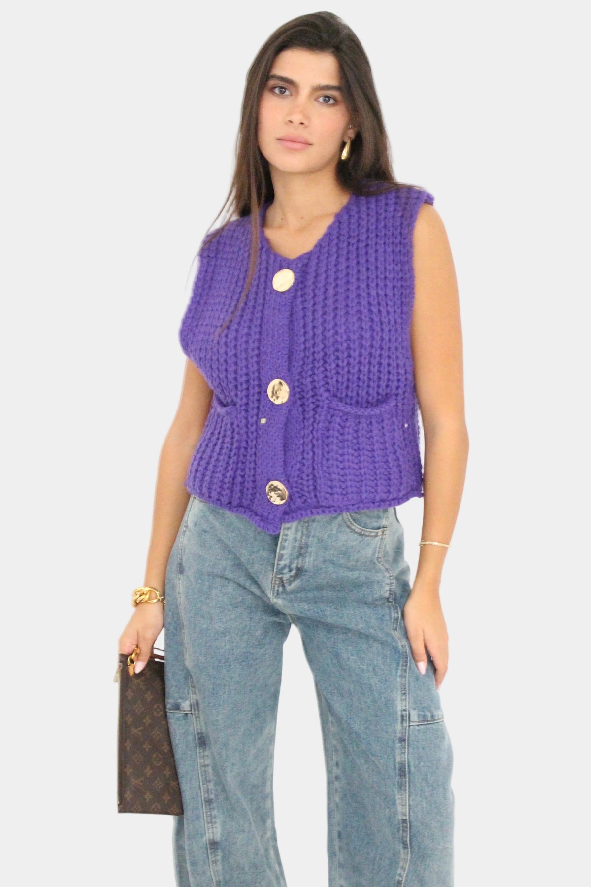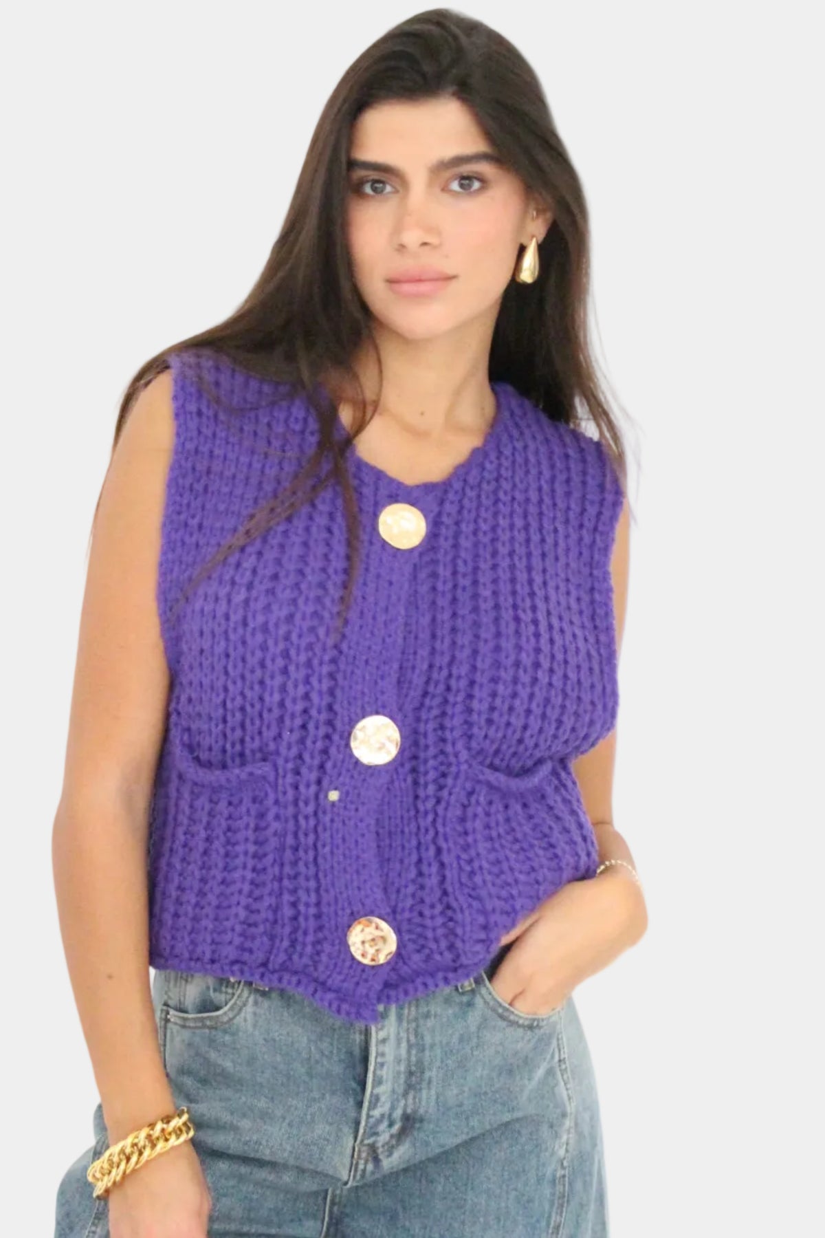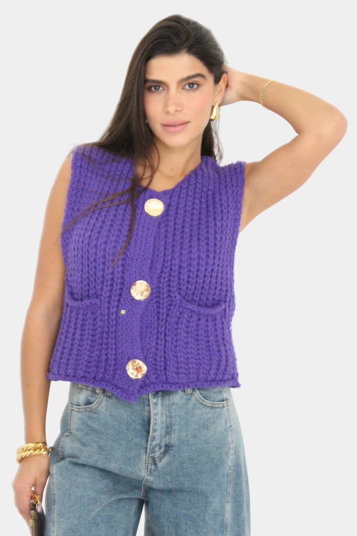 וסט סרוג ללא שרוולים בגזרה קלאסית, סריגה עבה ורכה עם כפתורים דקורטיביים וכיסים קדמיים למראה חמים וסטייליסטי.