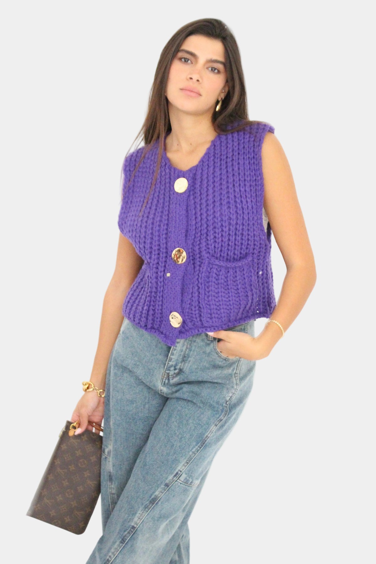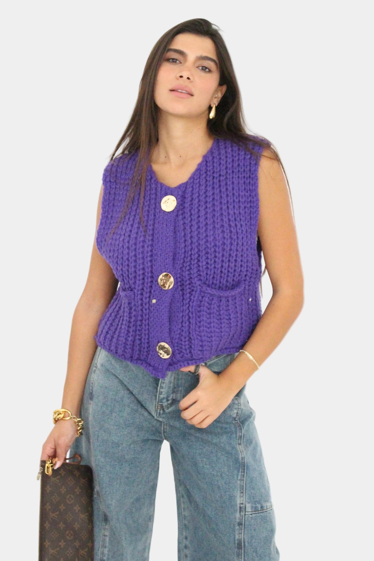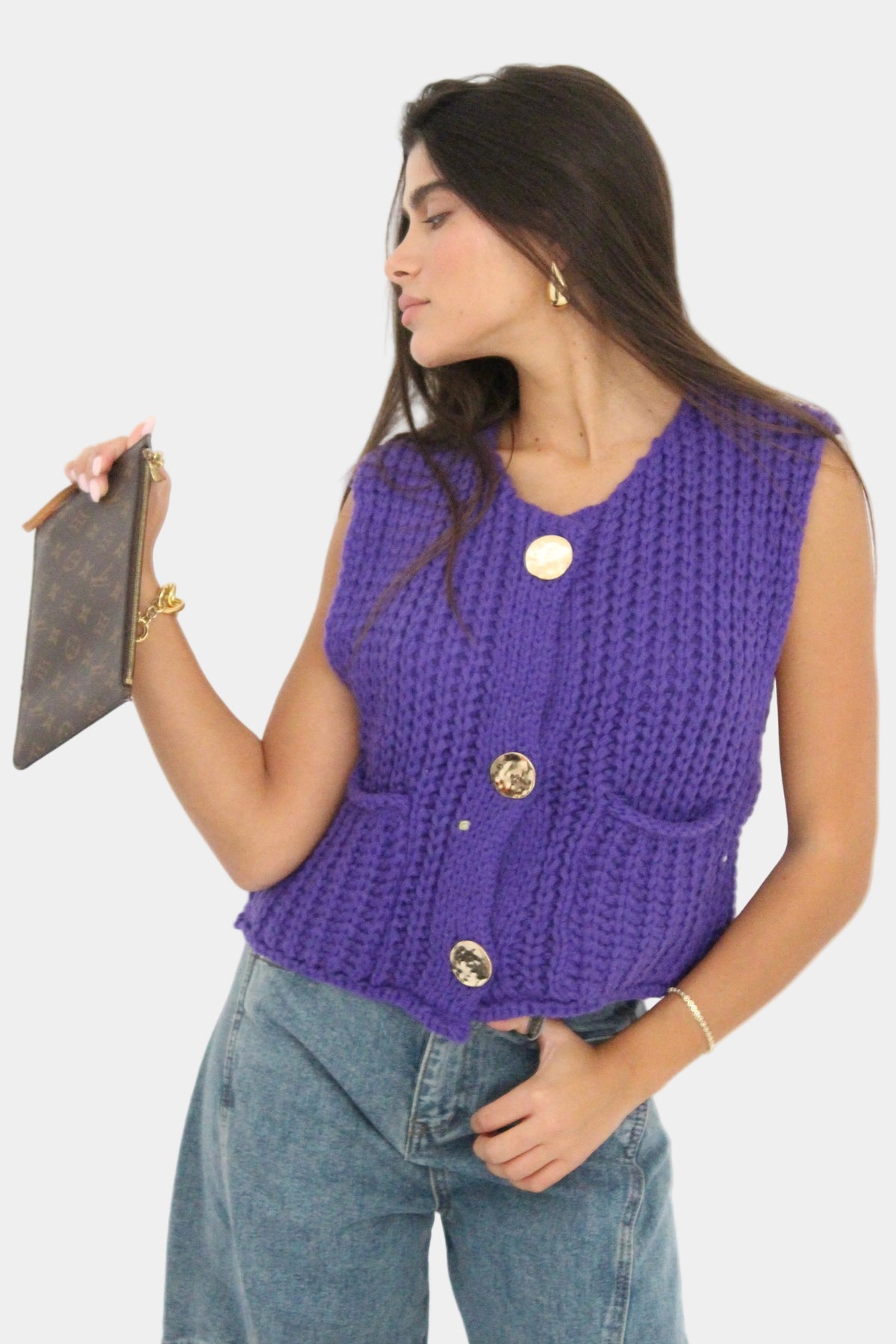 וסט סרוג ללא שרוולים בגזרה קלאסית, סריגה עבה ורכה עם כפתורים דקורטיביים וכיסים קדמיים למראה חמים וסטייליסטי.