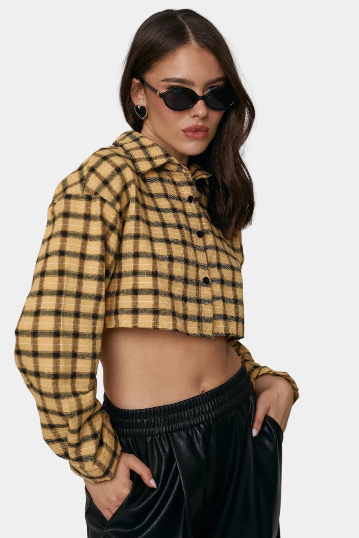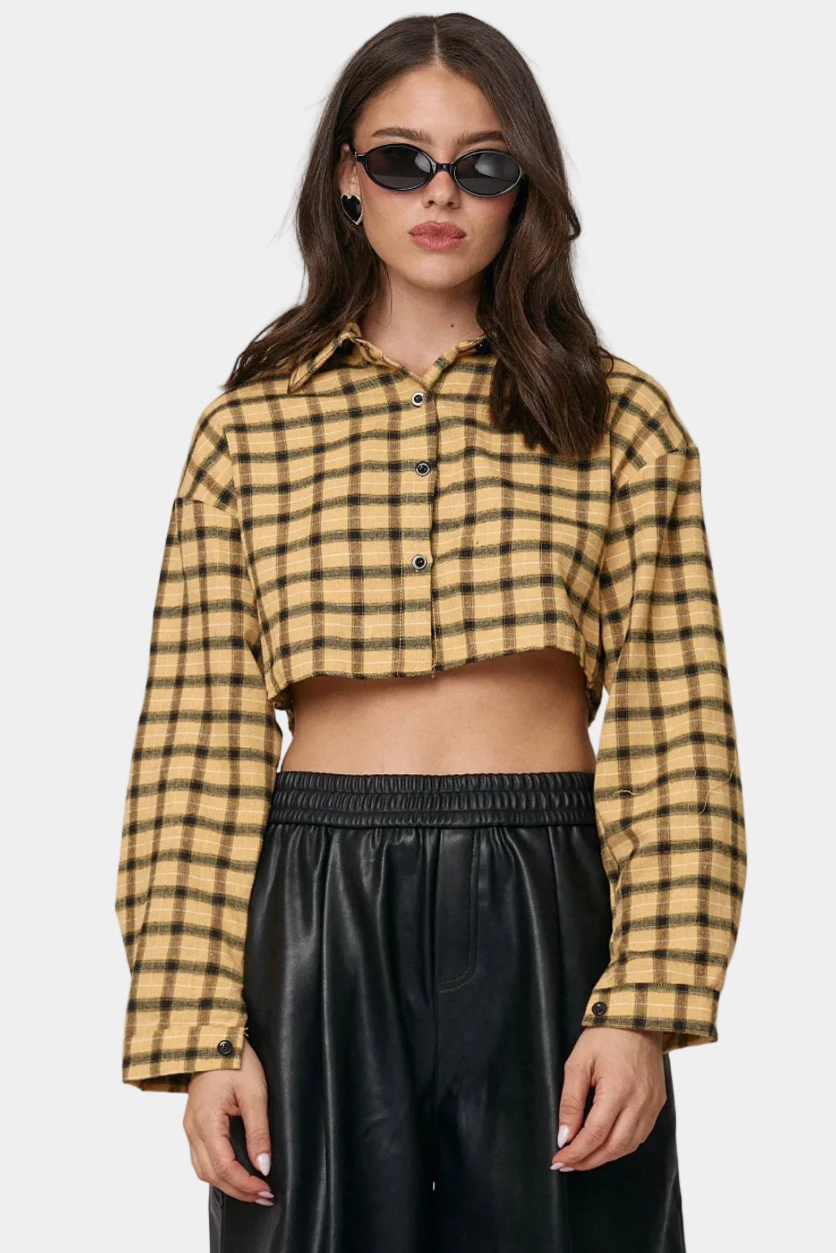 חולצת קרופ מכופתרת מבד פלנל בהדפס משבצות, בגזרה מחמיאה עם שרוולים ארוכים ולוק יומיומי־אופנתי.