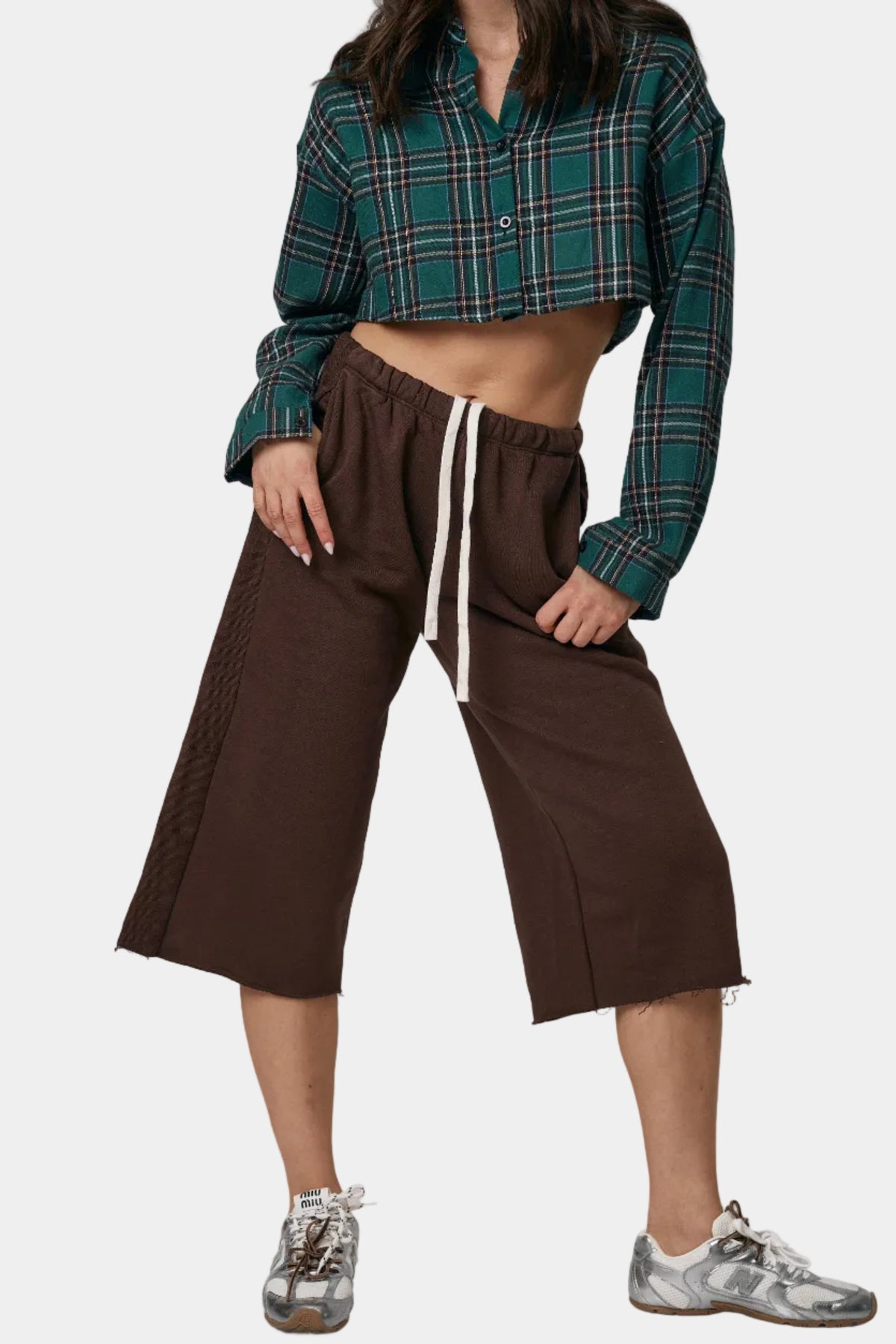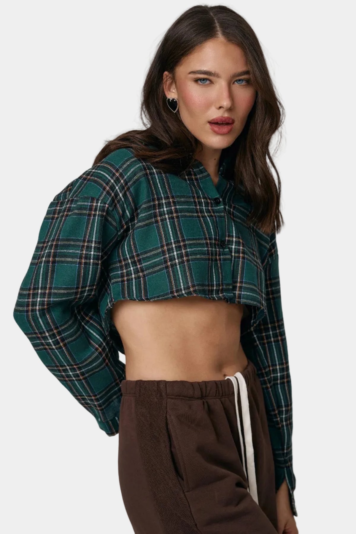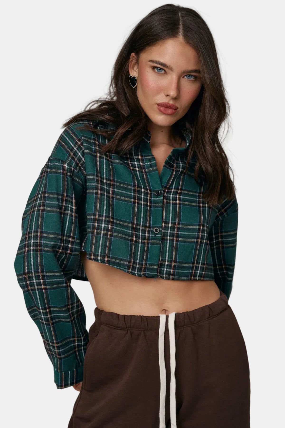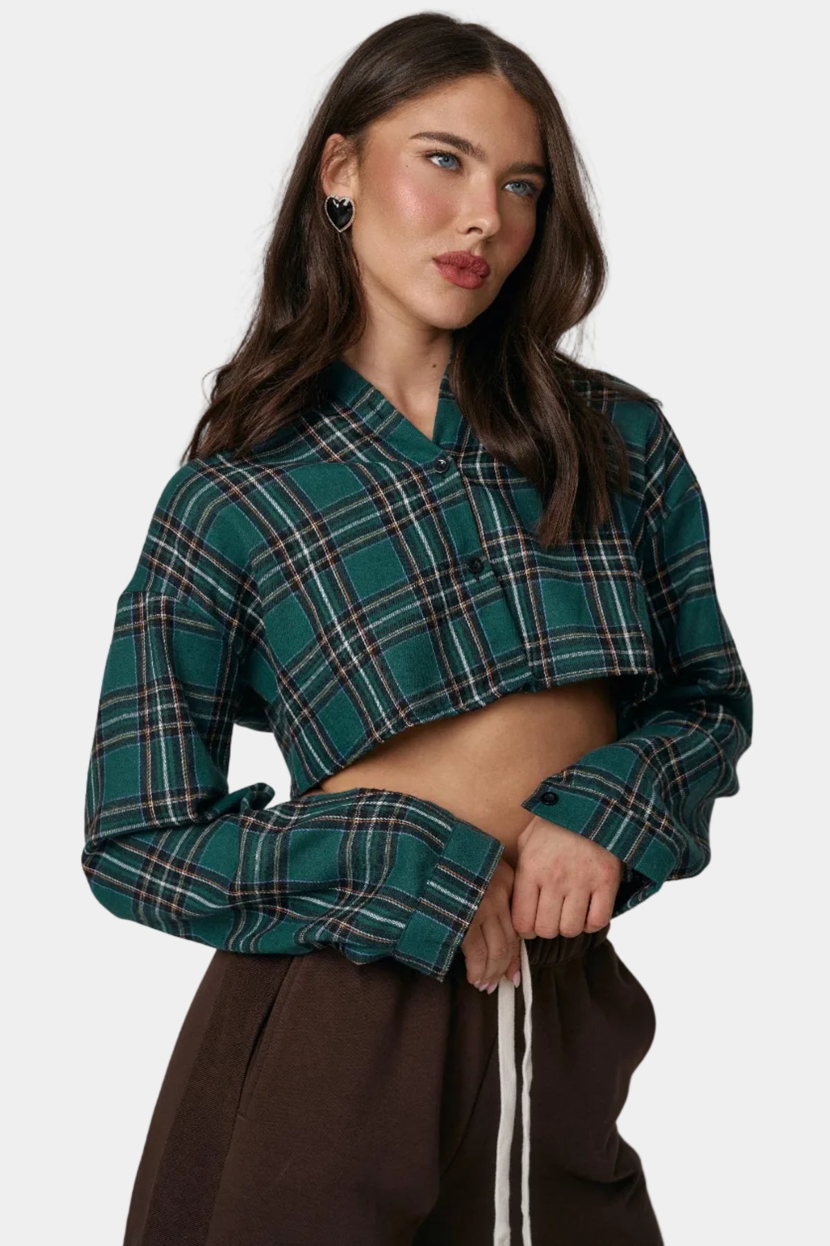 חולצת קרופ מכופתרת מבד פלנל בהדפס משבצות, בגזרה מחמיאה עם שרוולים ארוכים ולוק יומיומי־אופנתי.