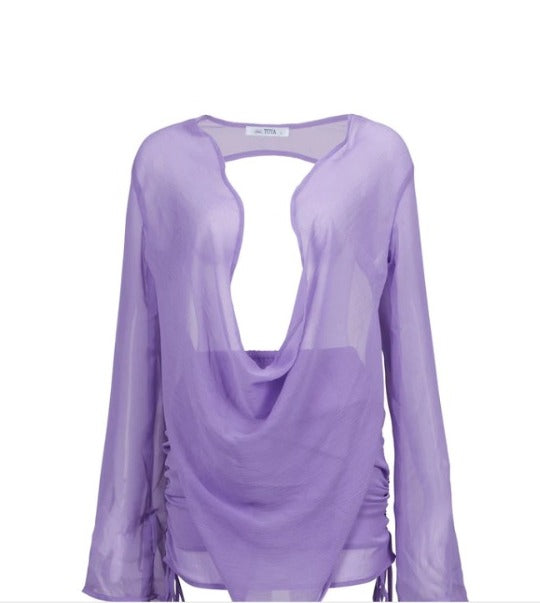חליפת חוף מגיעה עם חצאית מיני כיווצים בצד וחולצת חוף שכל הגב פתוח