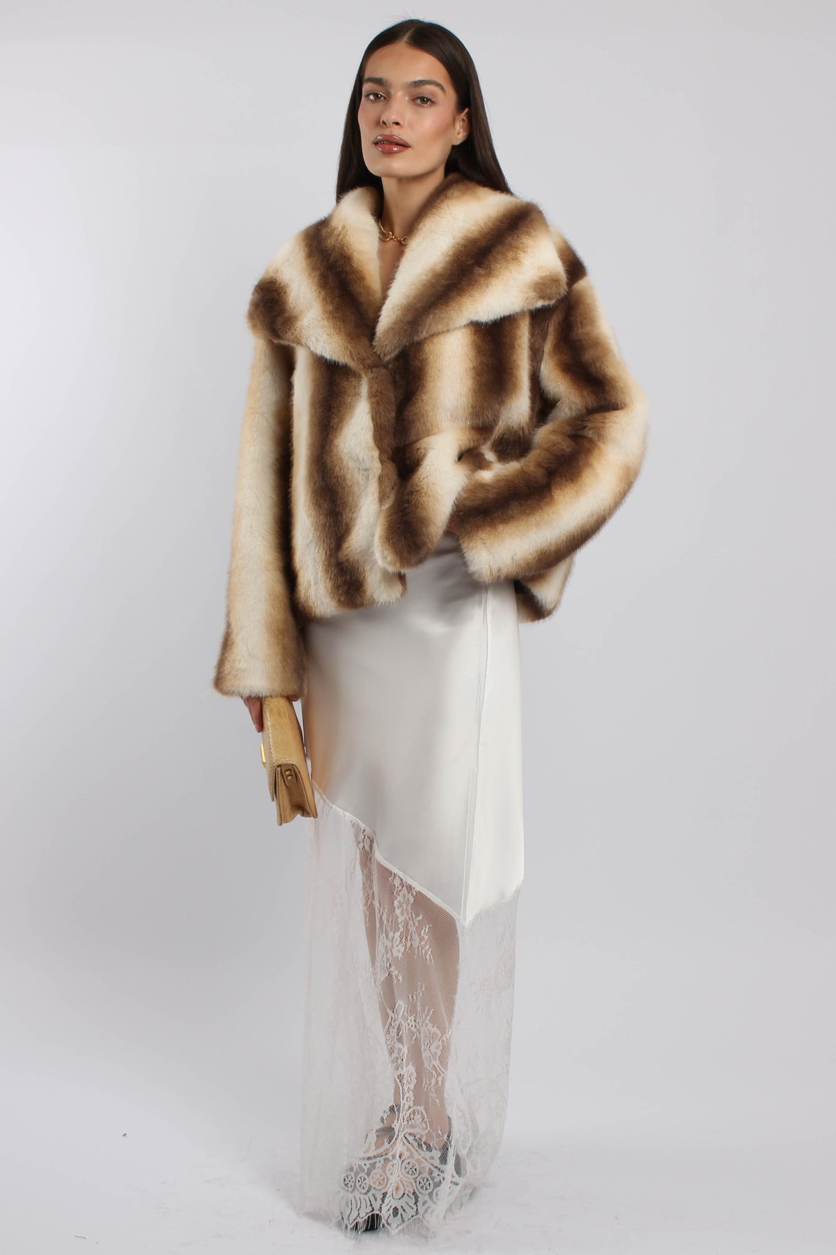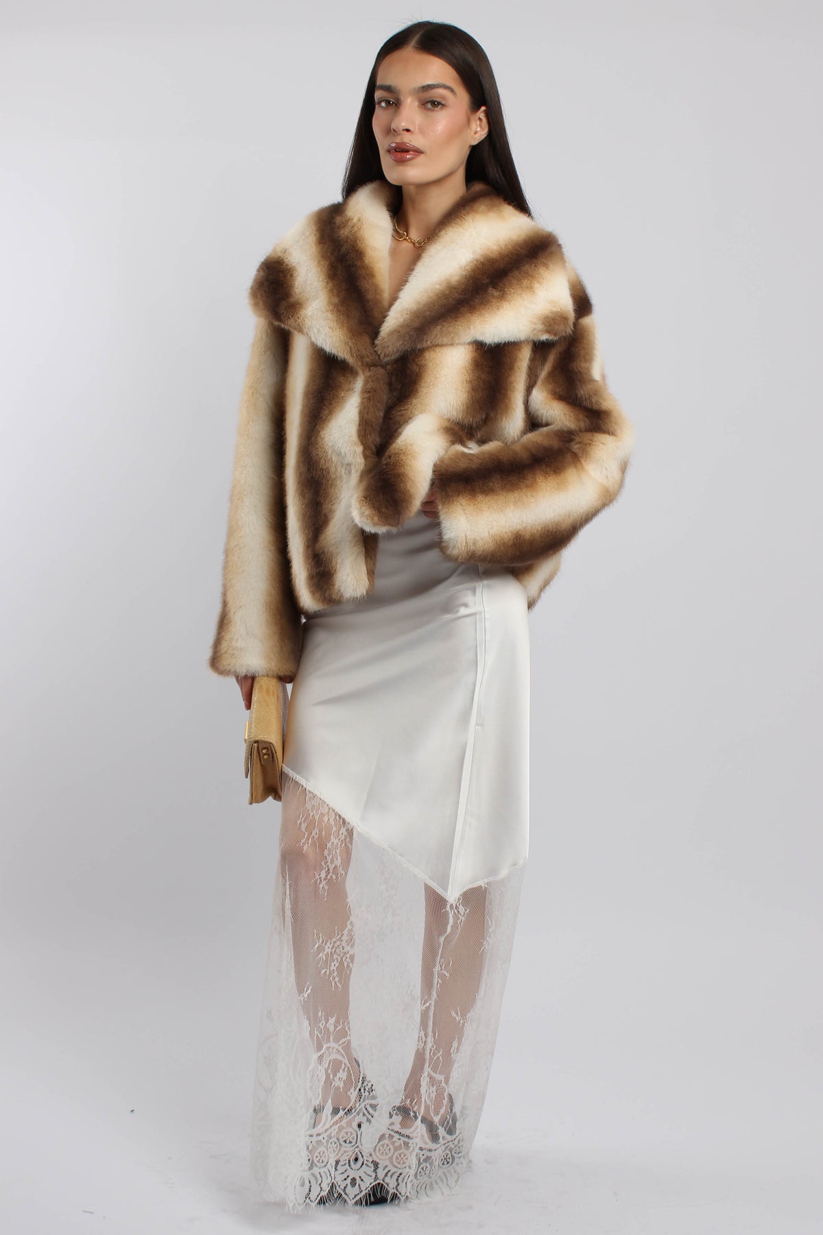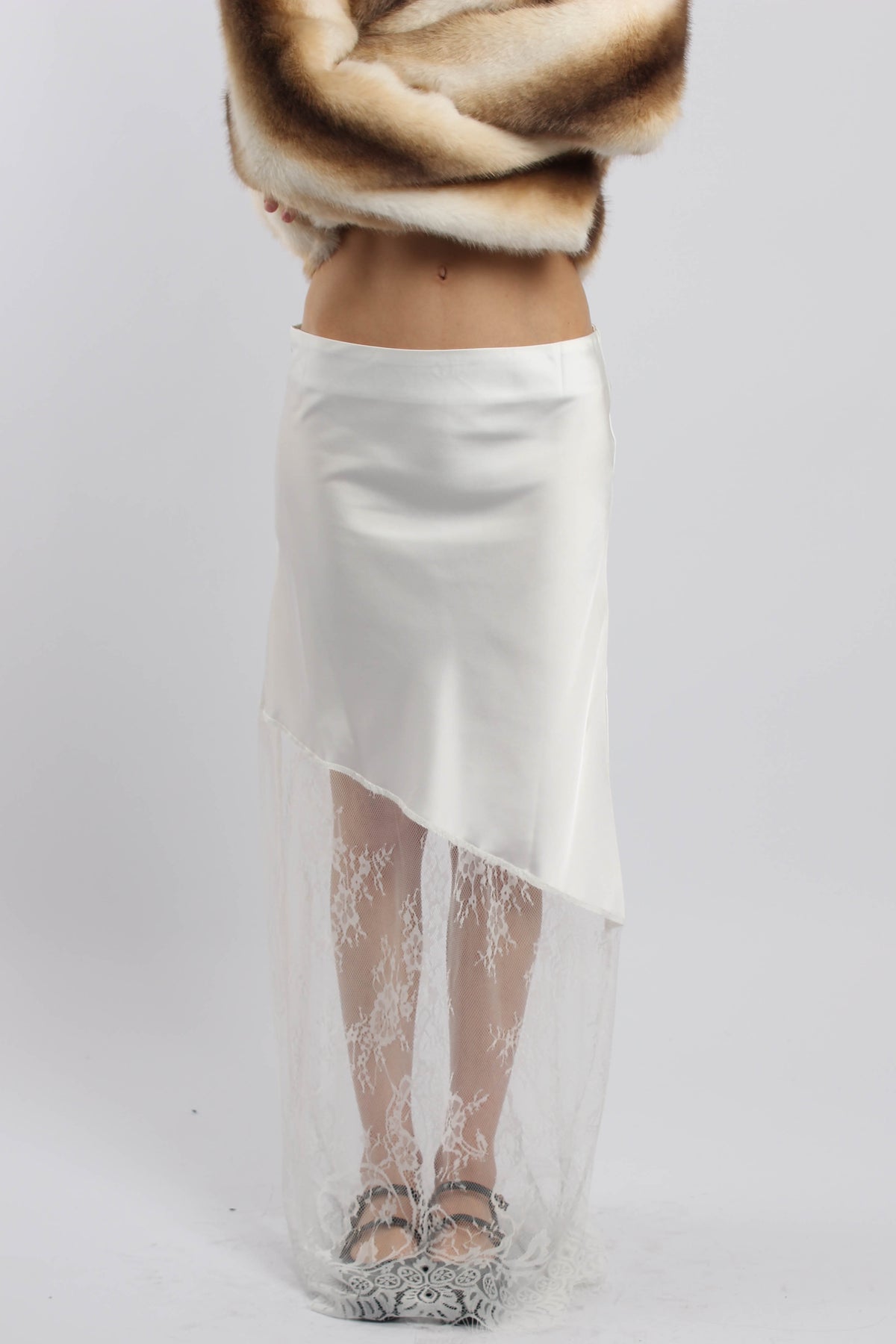 חצאית בגזרת מידי עם שכבת תחרה שקופה וסיומת אלגנטית, יוצרת מראה נשי ורך עם נוכחות ערב עדינה.