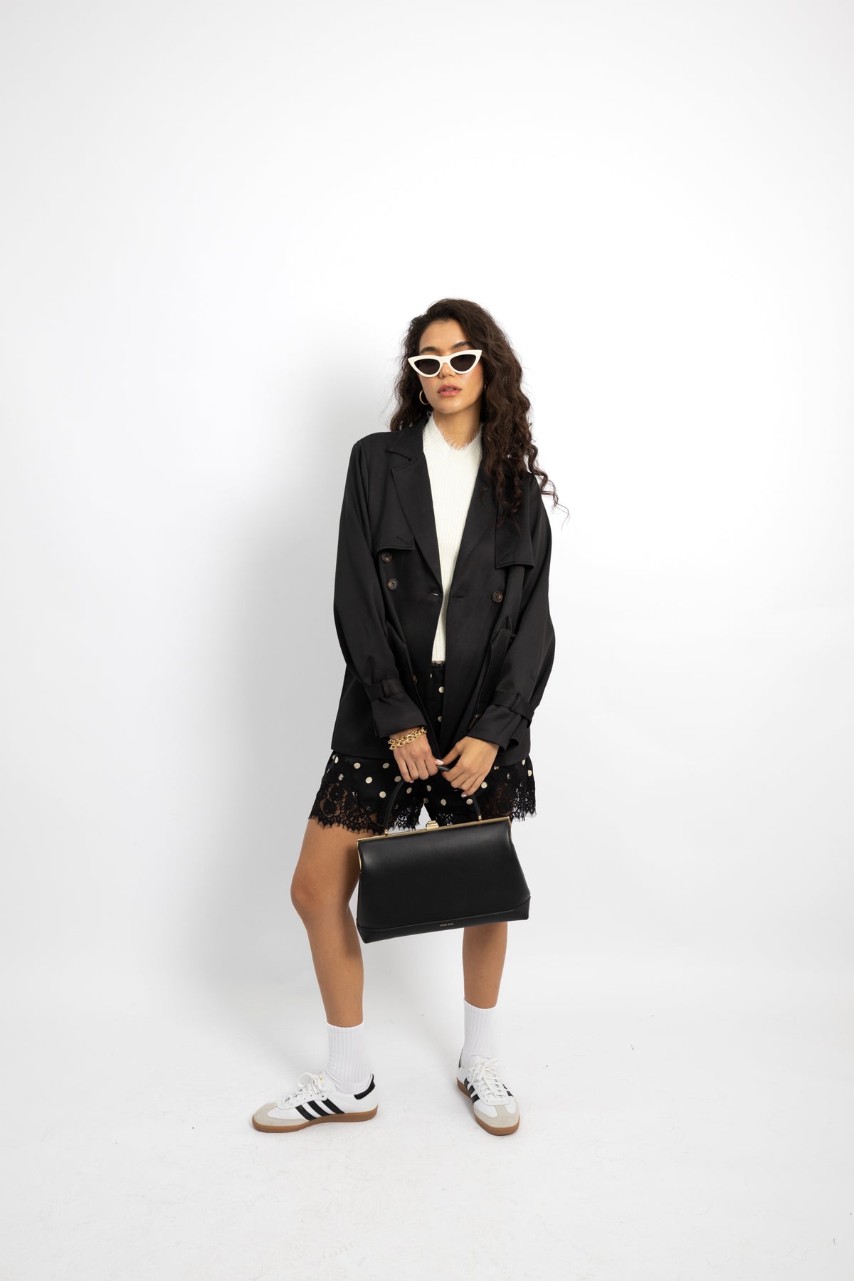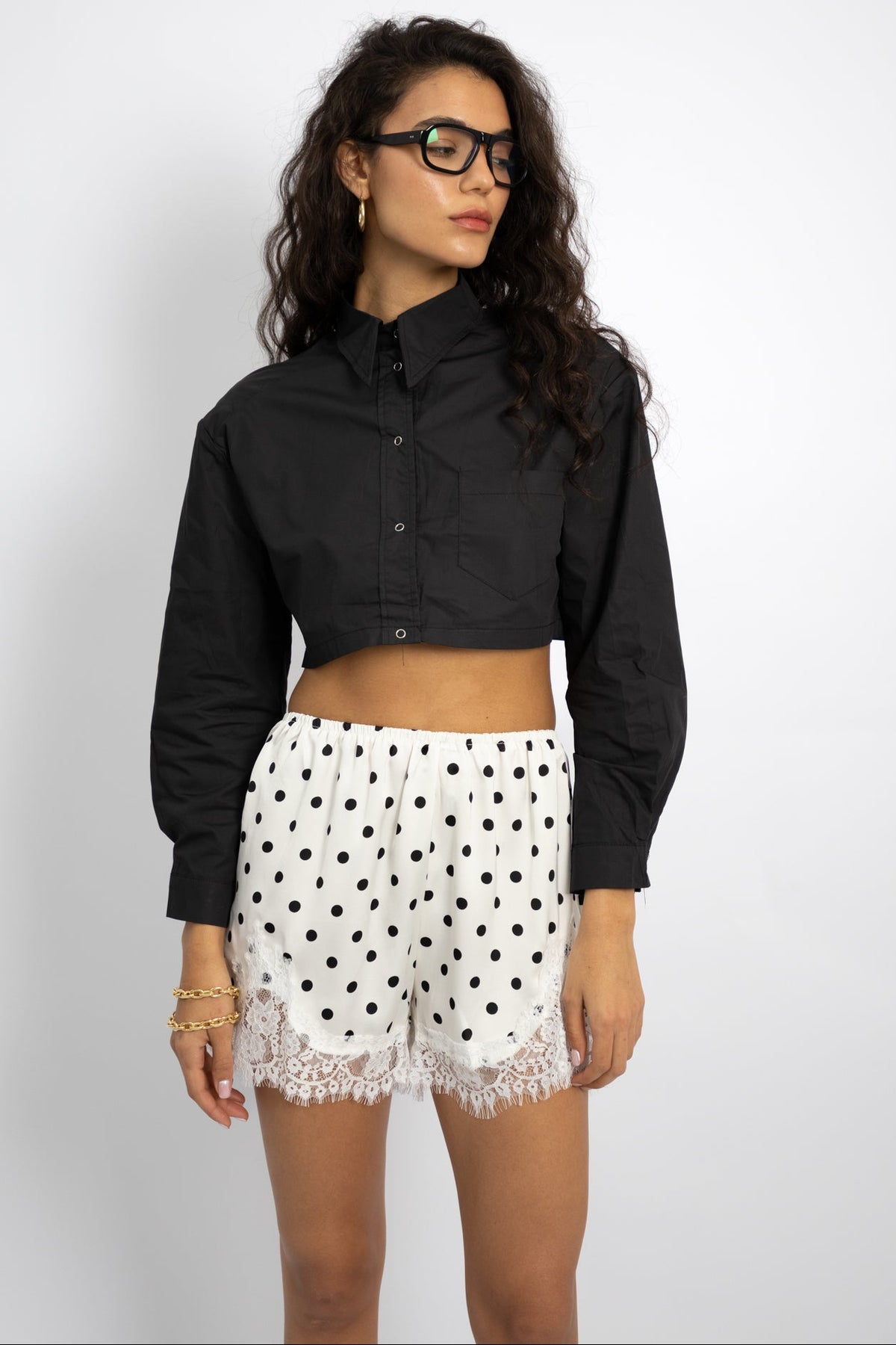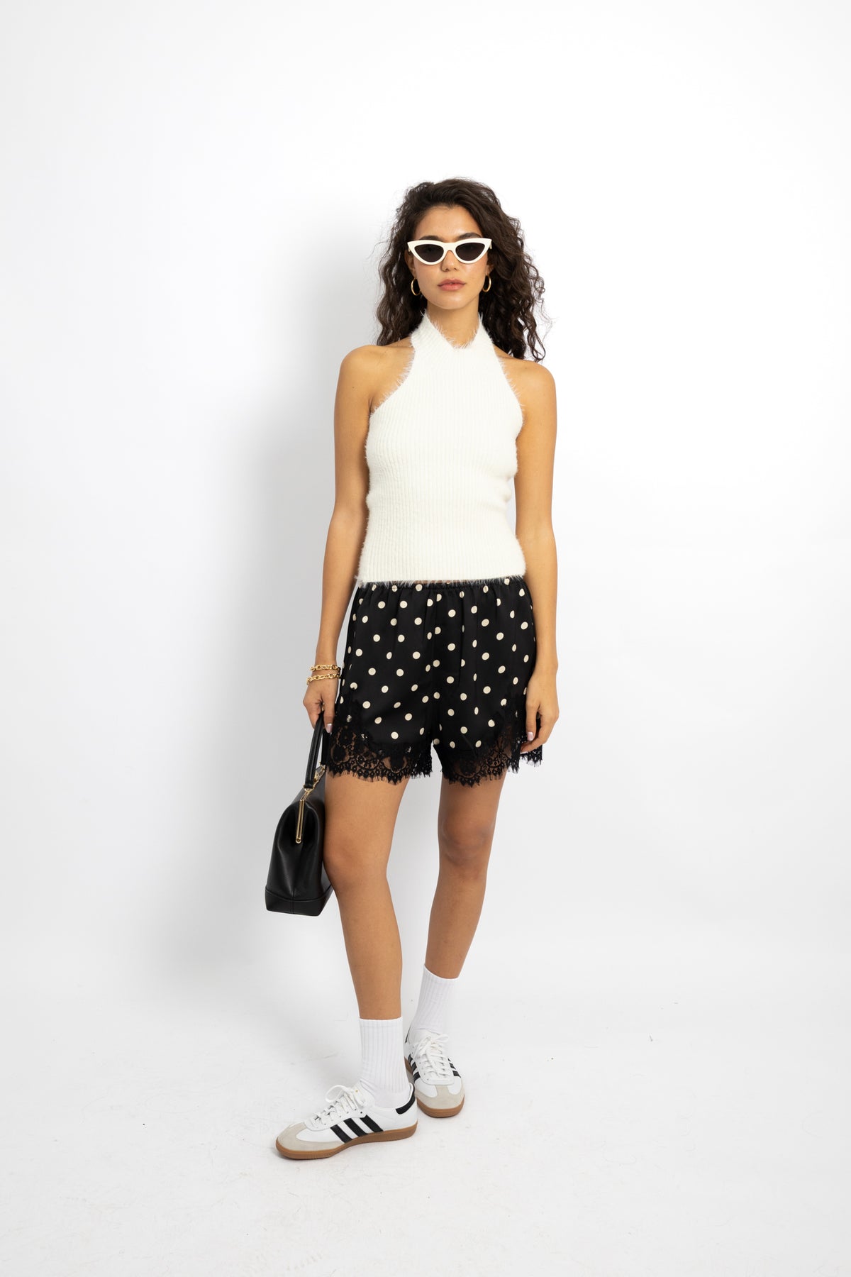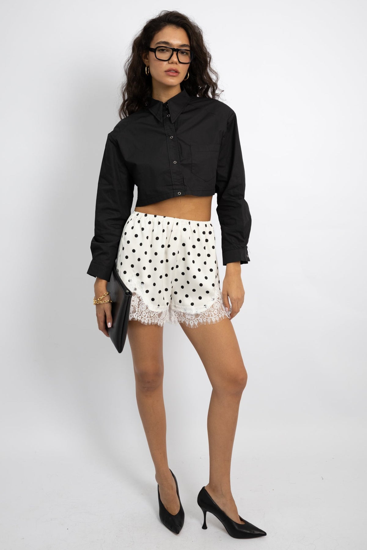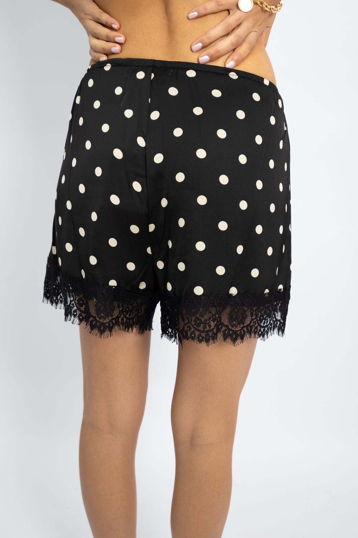 מכנס שורט קליל עם גומי במותן, בד נשפך ותחרה עדינה למראה אלגנטי ונוח ליום ולערב.
